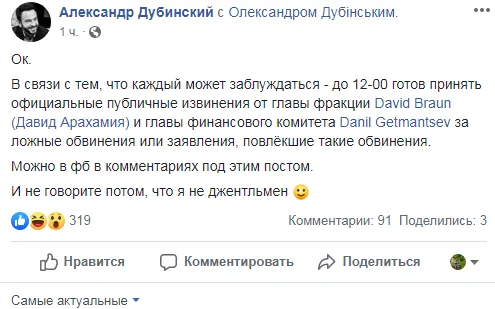 "У зв'язку з тим, що кожен може помилятися – до 12:00 готовий прийняти офіційні публічні вибачення від глави фракції Давида Арахамії і глави фінансового комітету Данила Гетьманцева за неправдиві звинувачення або заяви, такі звинувачення, що спричинили. Можна у фб в коментарях під цим постом", – написав Дубінський.