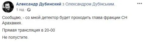 Дубінський заявив, що чекає вибачень від Арахамії, і написав про це на своїй фейсбук-сторінці. Зі свого боку, очільник фракції "Слуга народу" відповів у коментарях. Арахамія підтвердив 24 каналу, що перевірка на поліграфі справді відбудеться.