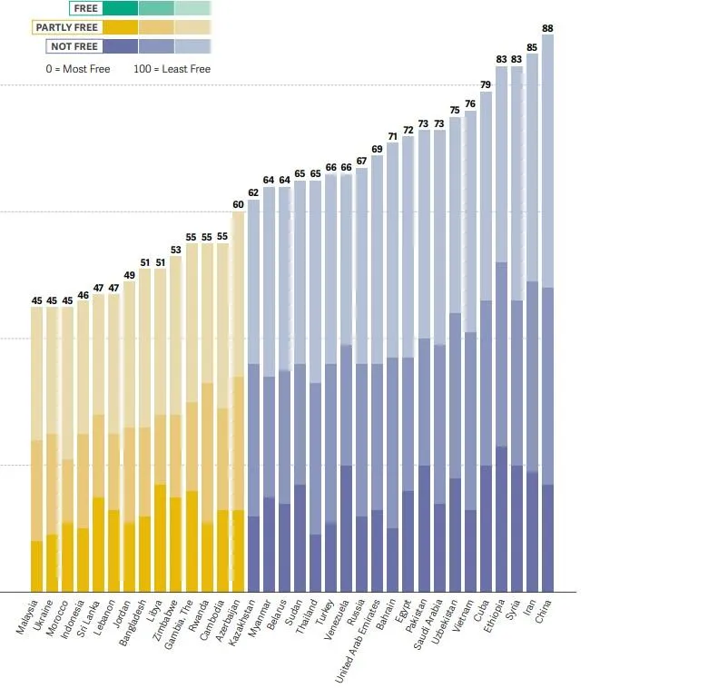 До слова, Freedom House щороку складає рейтинг свободи слова в інтернеті. В експертів є 9 параметрів оцінювання, зокрема наявність перешкод до доступу, обмеження контенту і порушення прав користувача.