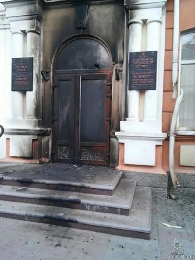 Зокрема, о 3:40 двоє невідомих осіб кинули кілька пляшок із запаленою рідиною у приміщення ради.