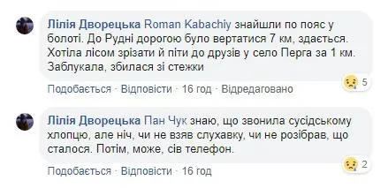 У коментарях до свого допису вона уточнила, що Ірину знайшли по пояс у болоті. Щоб повернутися до Рудні, їй потрібно було йти дорогою близько 7 кілометрів. Тож дівчина намагалася зрізати дорогу через ліс і піти до друзів у село Перга, проте заблукала.