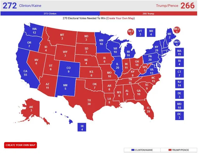 Отож, щоб стати наступним президентом, Гілларі Клінтон або Дональду Трампу (шанси інших кандидатів на перемогу близькі до 0), необхідно набрати 270 голосів виборників з 538. За даними соціологів станом на ранок вівторка рахунок у протистоянні Клінтон-Трамп складає 272 голоси проти 266 на користь кандидата від демократів. А це означає, що Трампу необхідно у день голосування переконати мешканців Нью-Гемпшира, де розрив між кандидатами складає 0,4%. Адже у решті "синіх штатів" перевага Клінтон більш ніж переконлива (від 1,9% і більше).