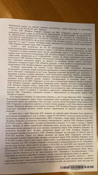 У судовій заяві зазначається, що під час розслідування було встановлено, що НЕК "Укренерго" не вжило належних заходів, передбачених главою 1.7 розділу І правил ринку. Зокрема, не було вчасно присвоєно ТОВ "Юнайтед Енерджі" статусів "Переддефолтний" та "Дефолтний" та не було направлено до АТ "Ощадбанк" довідку про прострочену заборгованість компанії за небаланси електроенергії.