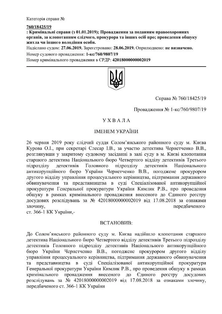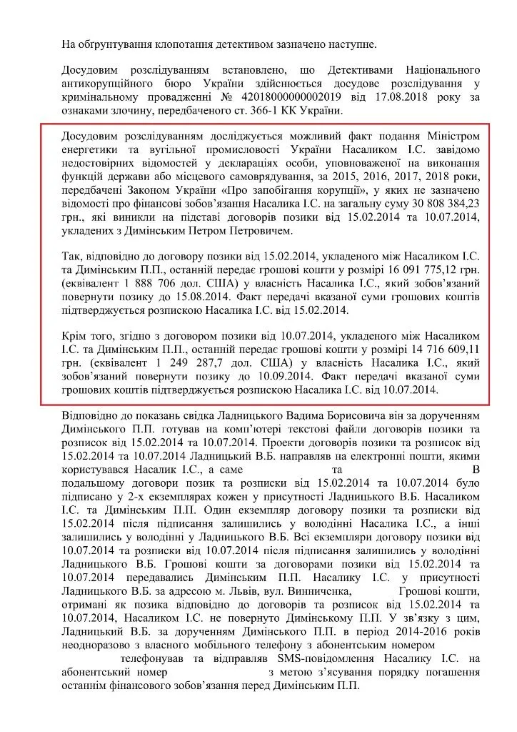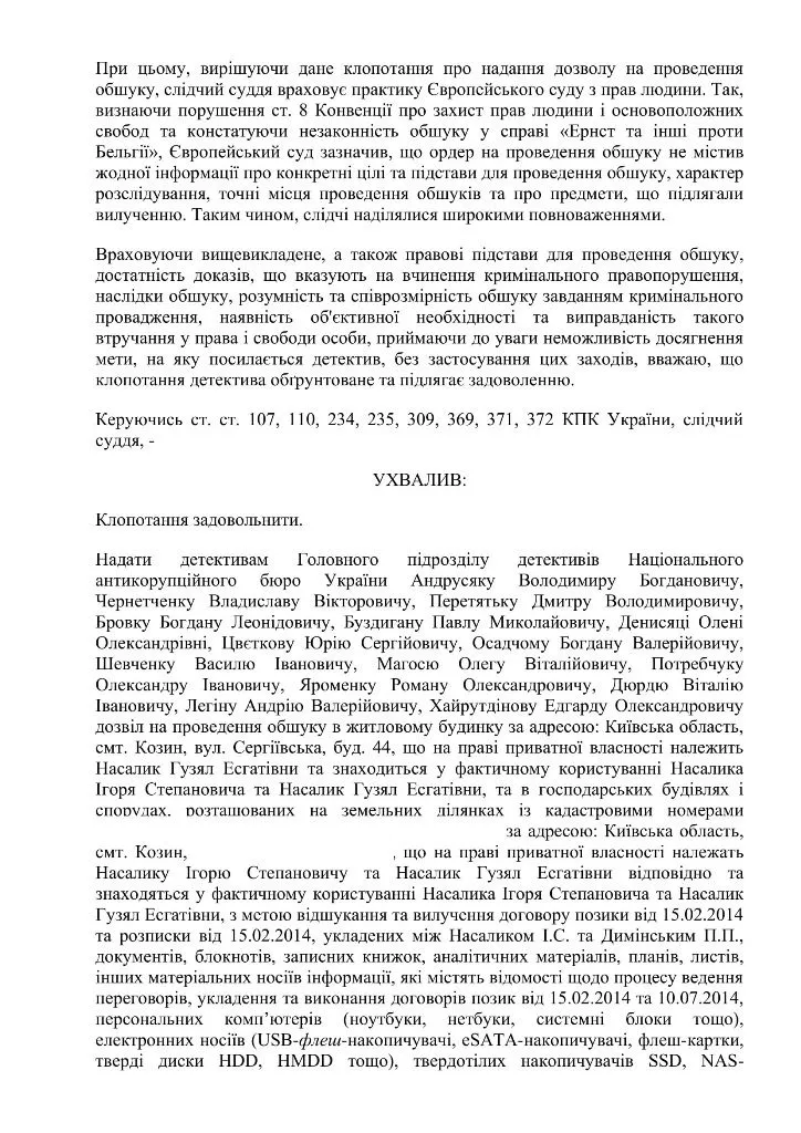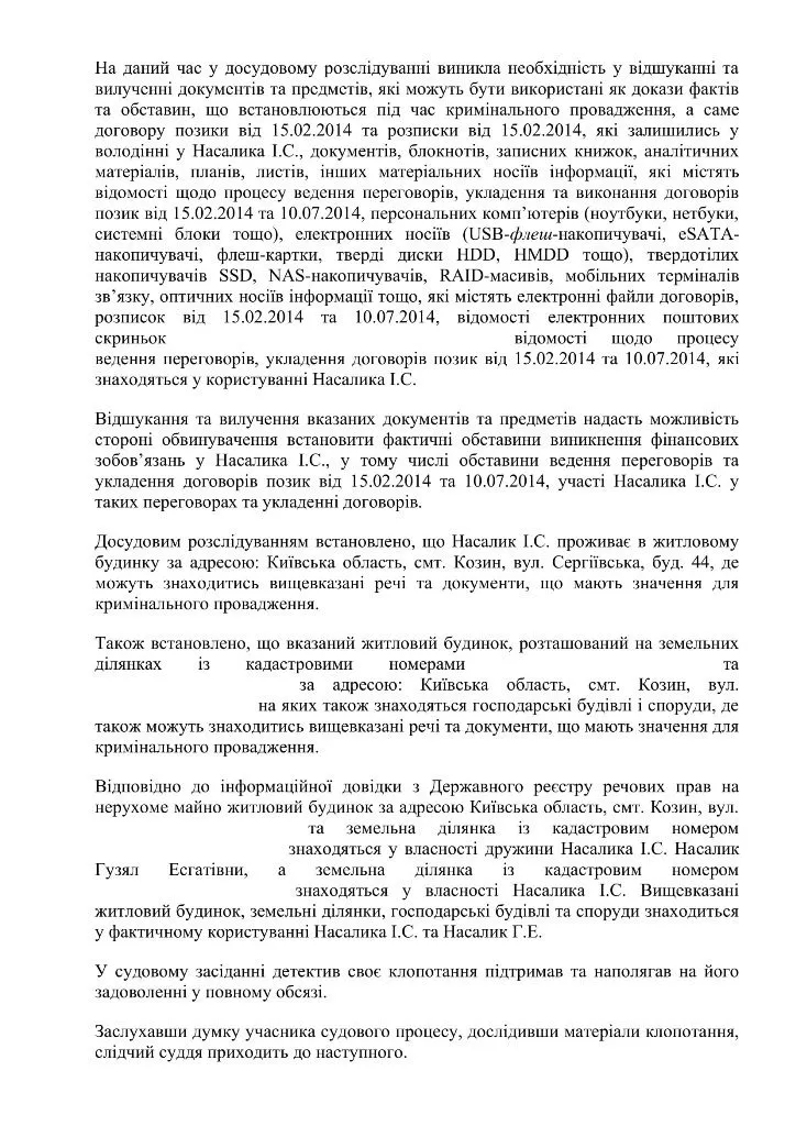 У журналістів опинився повний текст ухвали слідчого судді, яка надала дозвіл на обшук. З нього, зокрема, стає зрозуміло, що детективи НАБУ повинні були шукати в маєтку родини Насалика у Козині матеріали, що стосуються відразу двох боргових розписок міністра перед підприємцем, співвласником ФК "Карпати" Петром Димінським.