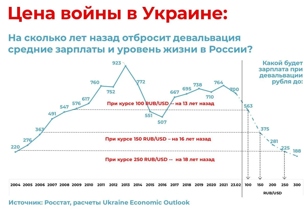 За цих умов населення скуповує товари довготривалого вжитку (автомобілі, електроніку, меблі, тощо) намагаючись хоча б так врятувати свої кошти від інфляції. Провідні макроекономічні експерти Росії прогнозують на цей рік 2-3 кратну девальвацію рубля та принаймні 30% інфляцію. Що означає, що середня зарплата в РФ може знизитися в 2022 році нижче еквівалента 300 доларів (у Москві – нижче 620 доларів).