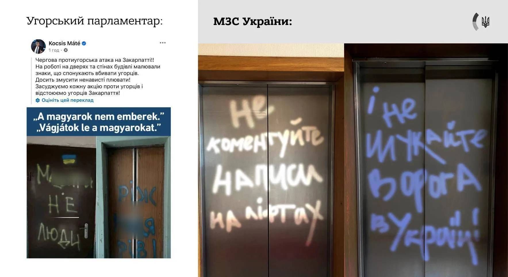 Мате Кочиш стверджує, що у Мукачеві на дверях і стінах нібито з’явилися написи, що закликають до "вбивства угорців". Як підтвердження він прикріпив до допису фото, на яких видно образливі написи в бік громадян Угорщини.