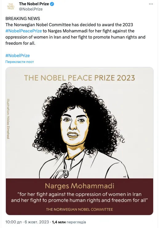 Нагорода Нобелівської премії миру у 2023 – найвища нагорода у цьому списку і визнання, що її жертва не марна.