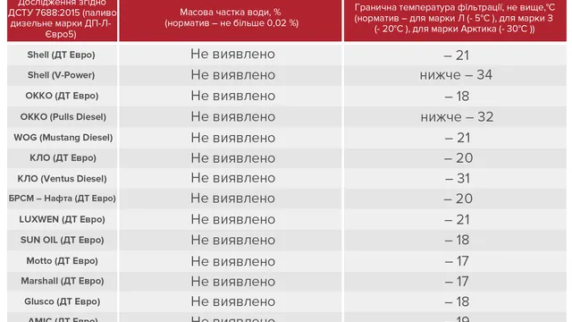 Експерти відвідали заправки в Києві практично всіх великих мереж, і вибірково – невеликі мережі. "Під приціл" потрапили Shell, ОККО, WOG, Glusco, AMIC, КЛО, ANP, БРСМ-Нафта, SunOil, LUXWEN, Motto, Marshall. Досліджували як звичайне дизельне паливо, так і "фірмові" сорти, які, за заявами продавців, мають поліпшені параметри. Список параметрів також був досить великий – цетановий індекс, фракційний склад, температура спалаху в закритому тиглі, вміст сірки, щільність. І, звичайно, головні "зимові" показники – граничну температуру фільтрації і масову частину води. Результати здивували бувалих експертів – "бодяги" не виявилося ні в кого, і лише один зразок виявився Євро-4, інші відповідали високому класу Євро-5.