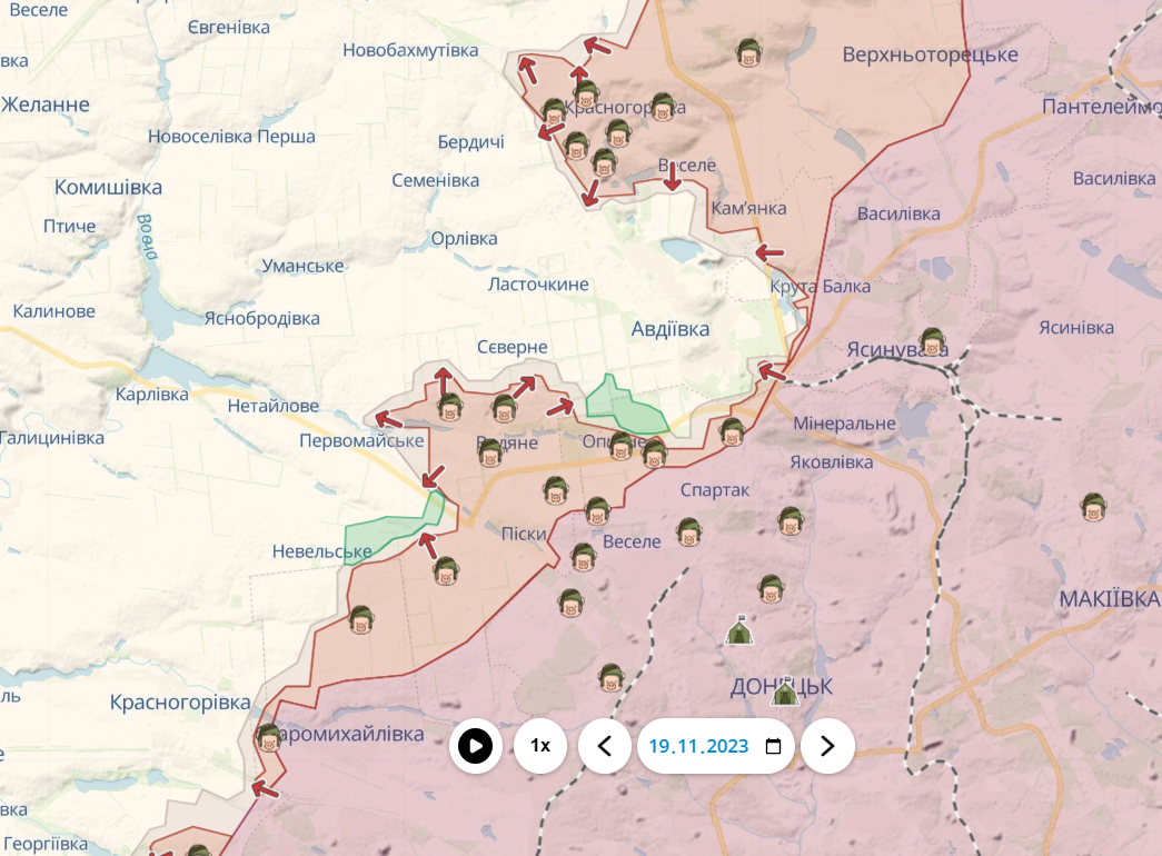 Так само росіяни продовжують тиснути в південному й північному напрямках від окупованої Красногорівки. Натомість на південно-західному фасі в районі Водяного й Опитного ворог минулого тижня жодних серйозних успіхів не мав.