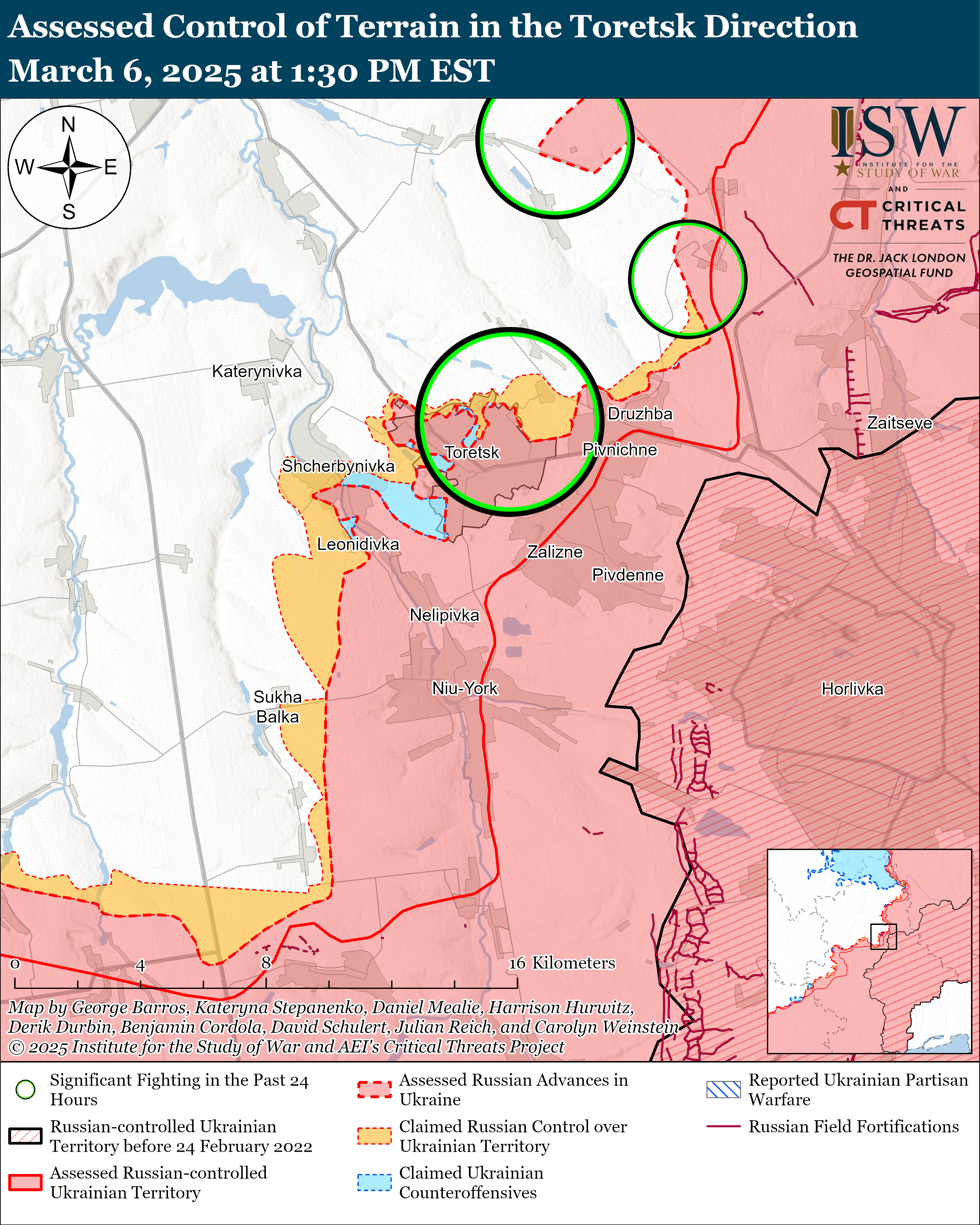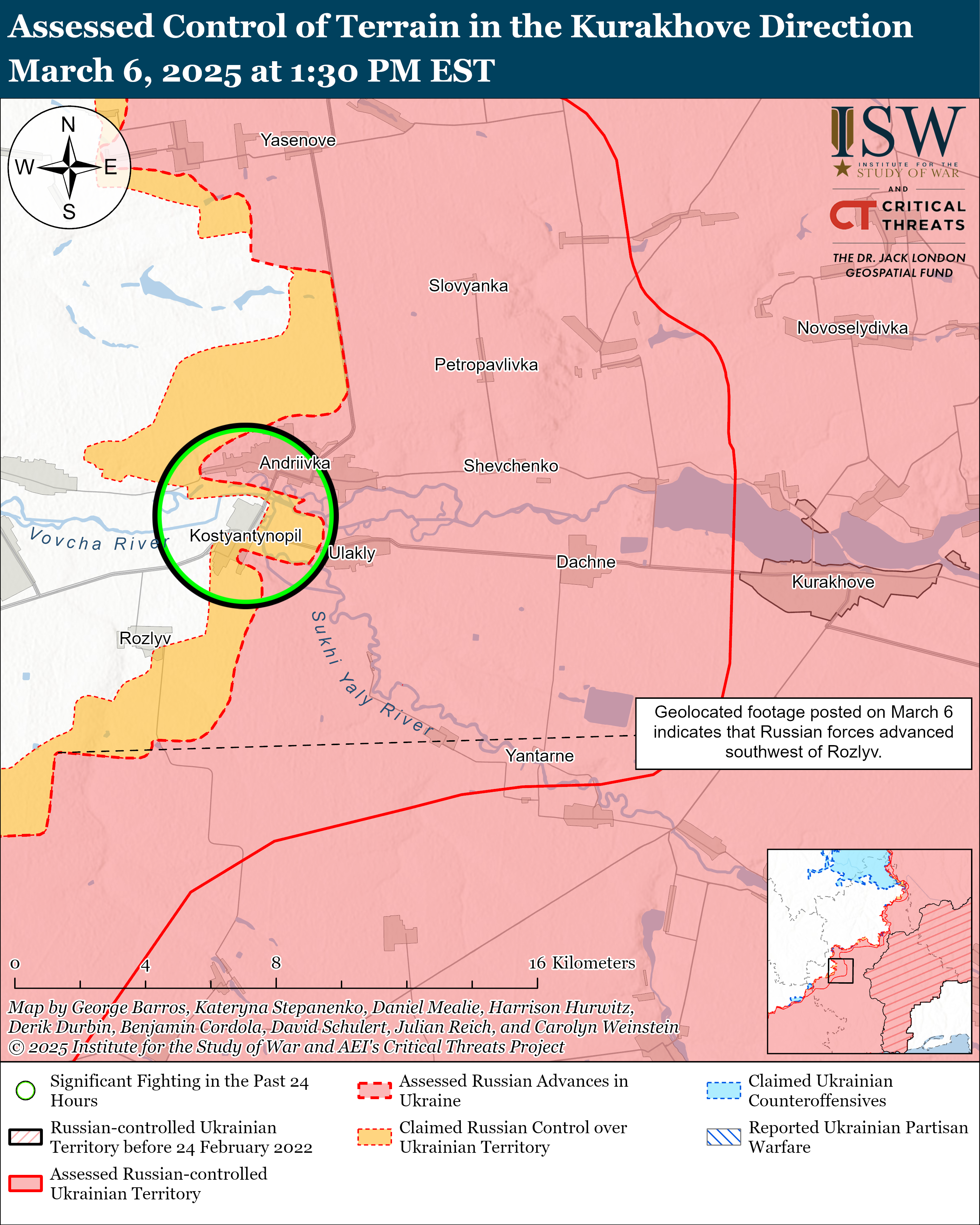 Українські та російські сили нещодавно просунулися на Покровському напрямку. Геолокаційні кадри за 5 березня, показують, що українські сили мали незначне просування у східному Піщаному (на південний захід від Покровська). Тим часом росіяни захопили Зелене Поле (на схід від Покровська).