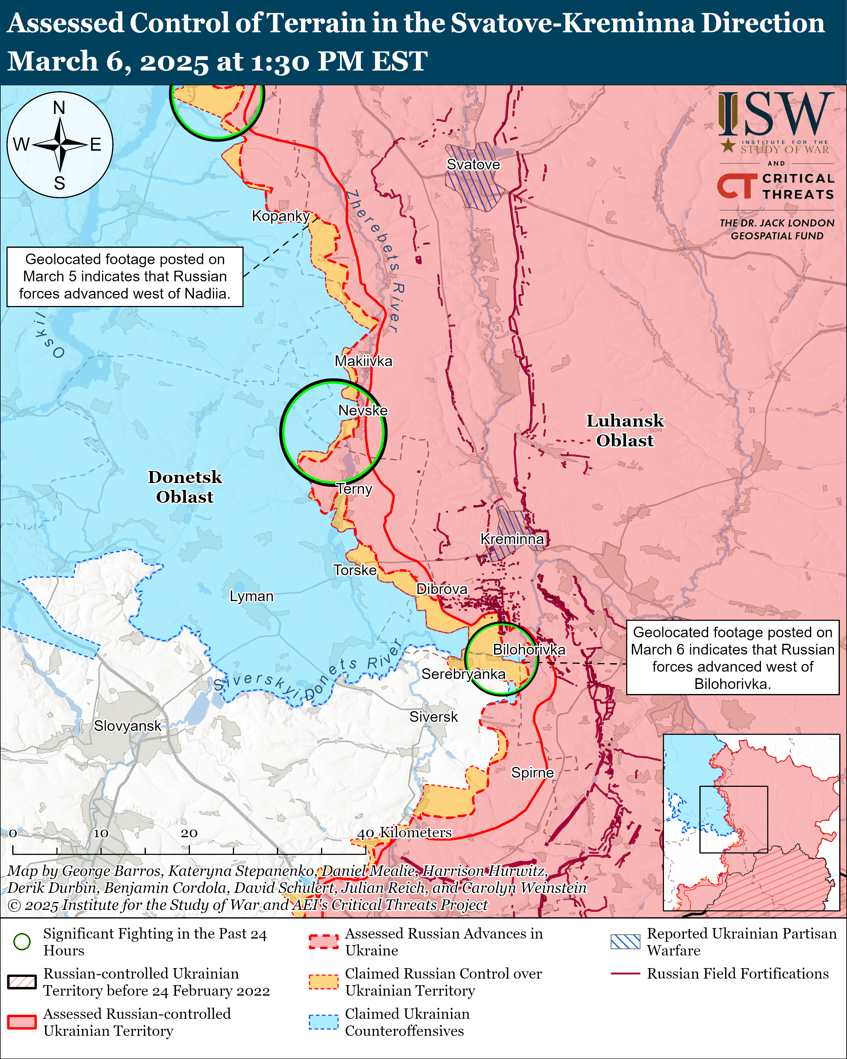 Також противник мав досягнення у напрямку Борової, що на Харківщині. Геолокаційні кадри, опубліковані 5 березня, показують, що російські війська просувалися на захід від Надії (на схід від Борової).