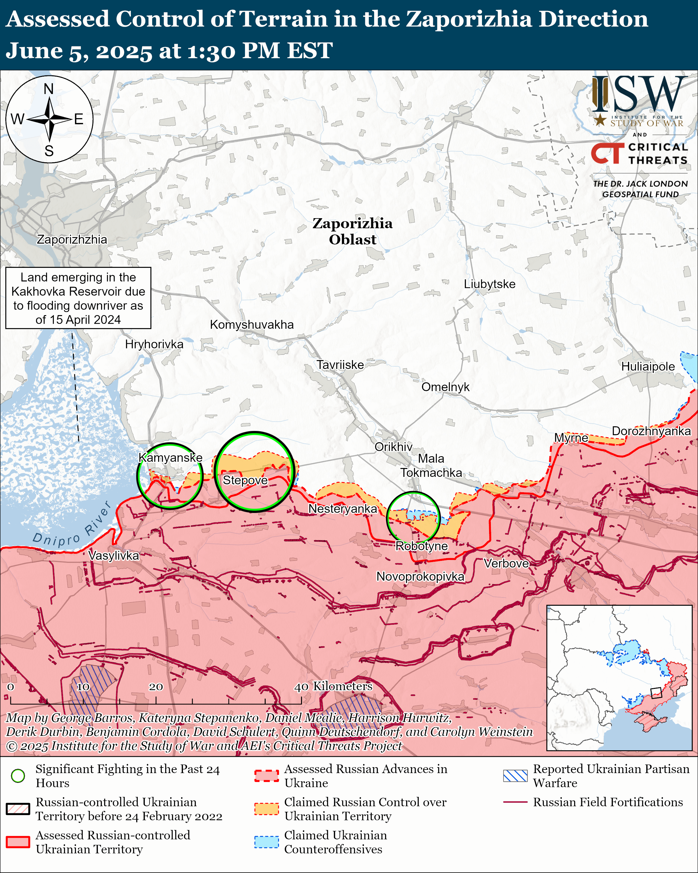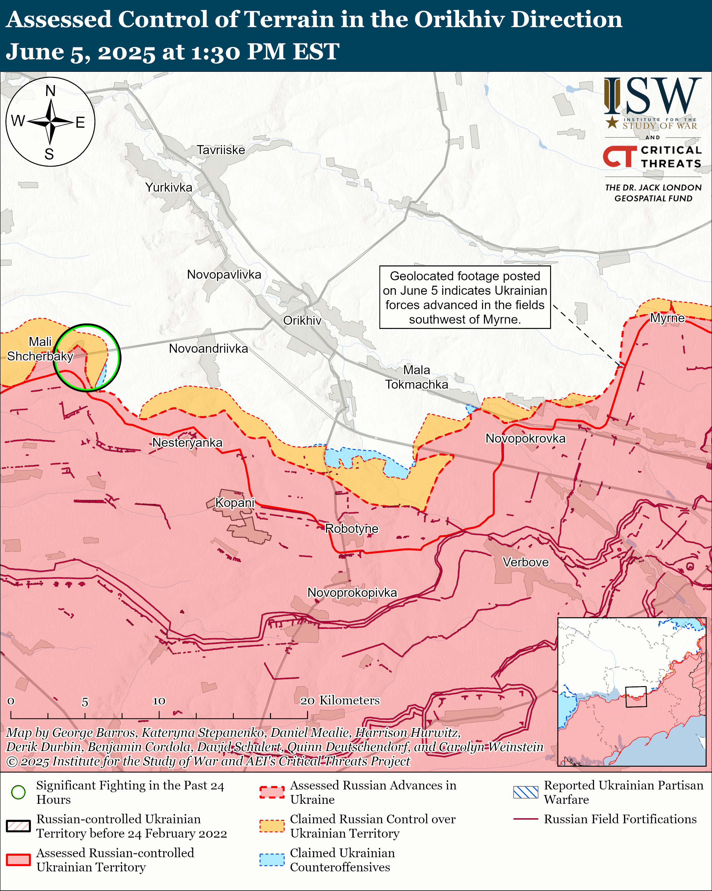 Зверніть увагу! Українські сили трохи просунулися на Запоріжжі. Геолокаційні кадри, опубліковані 5 червня, свідчать про незначне просування українських військ на південний захід від Мирного (південний захід від Гуляйполя).