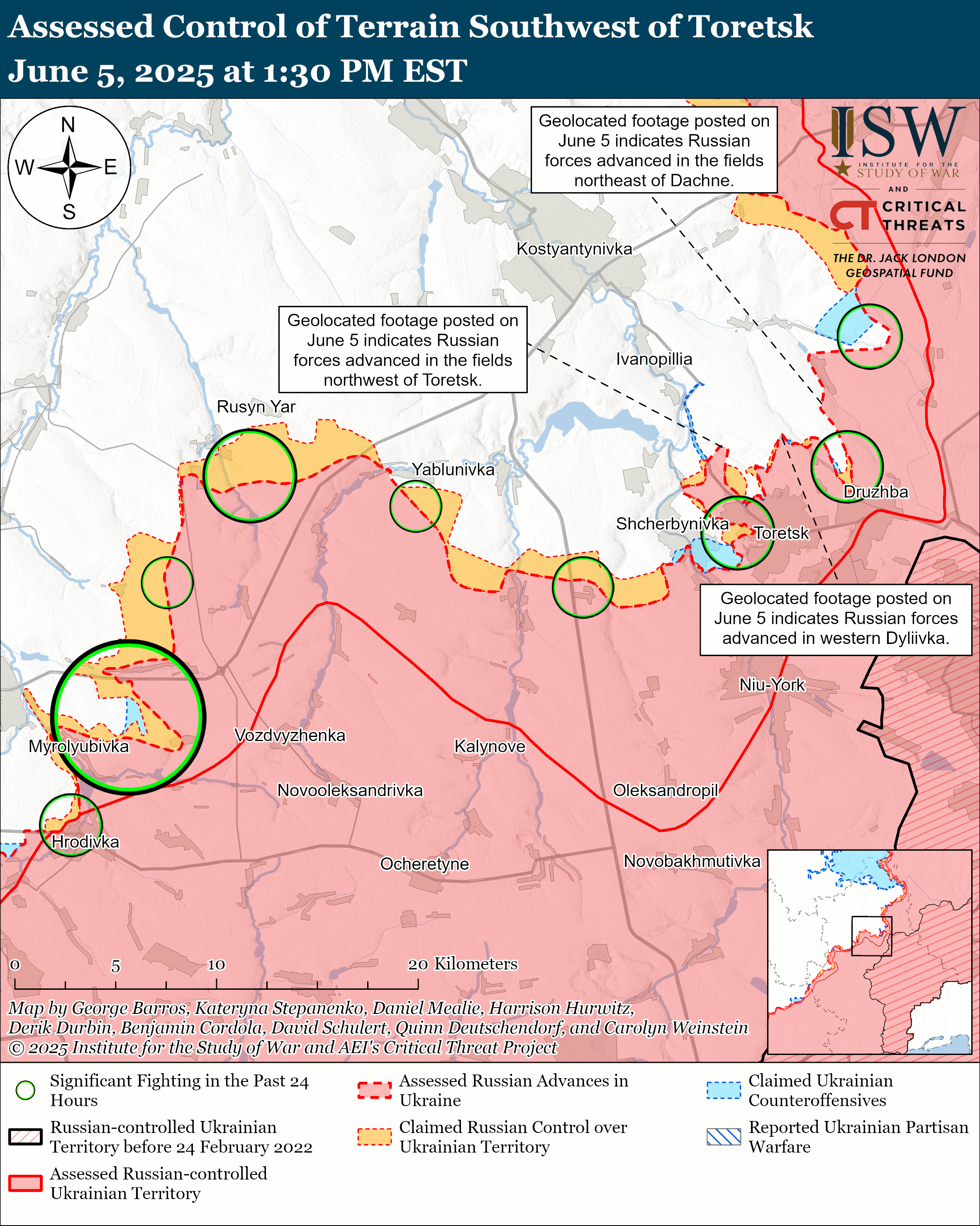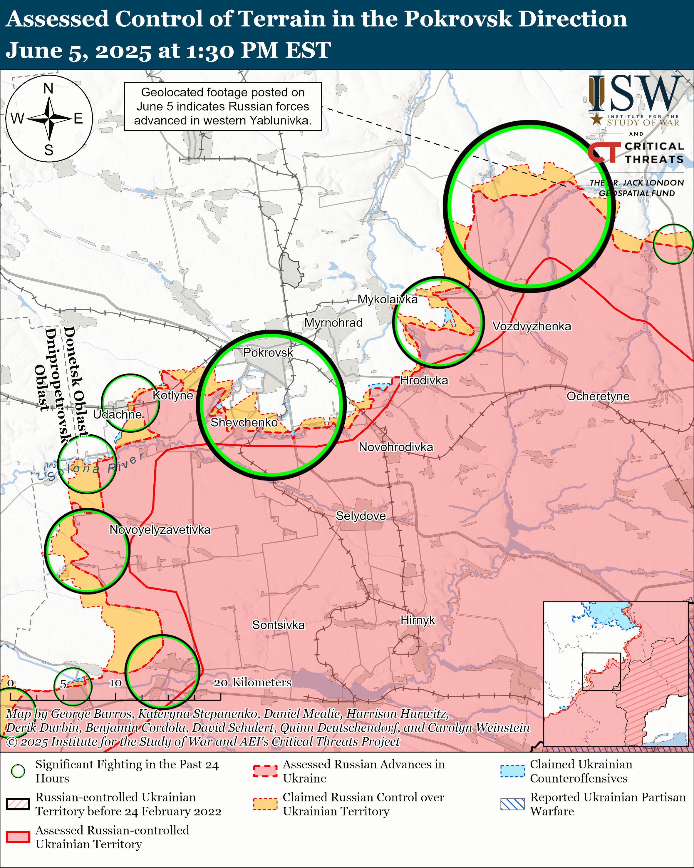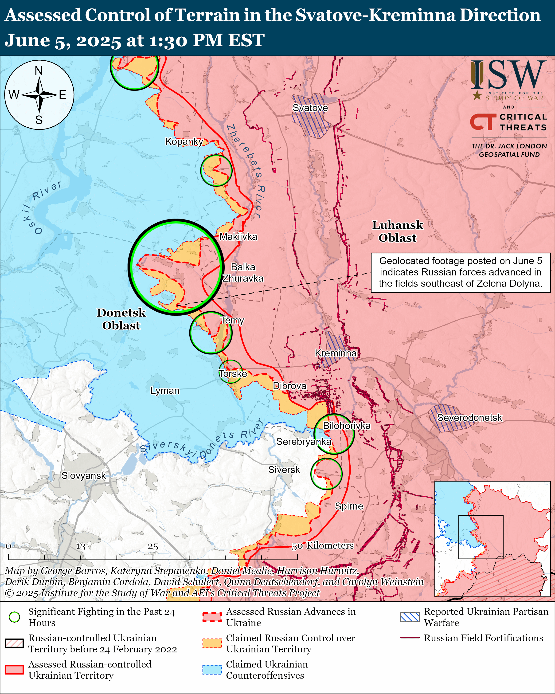 Також геолокаційні відео за 5 червня показують просування військ росіян на південний схід від Зеленої Долини (на північ від Лимана).