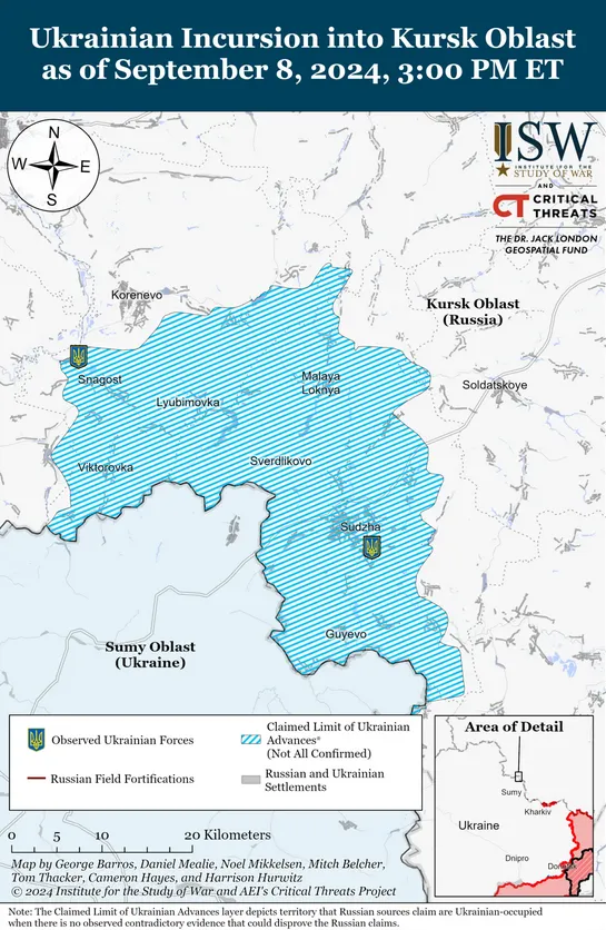 ЗСУ продовжили наступ на південний захід від Коренево в районах Снагоста та Вишневки, на північний захід від Суджі в районі Малої Локні, на північ від Суджі поблизу Мар'ївки, на північний схід від Суджі біля Мартинівки, а також на південний схід Суджі у районі Черкаської Конопельки.