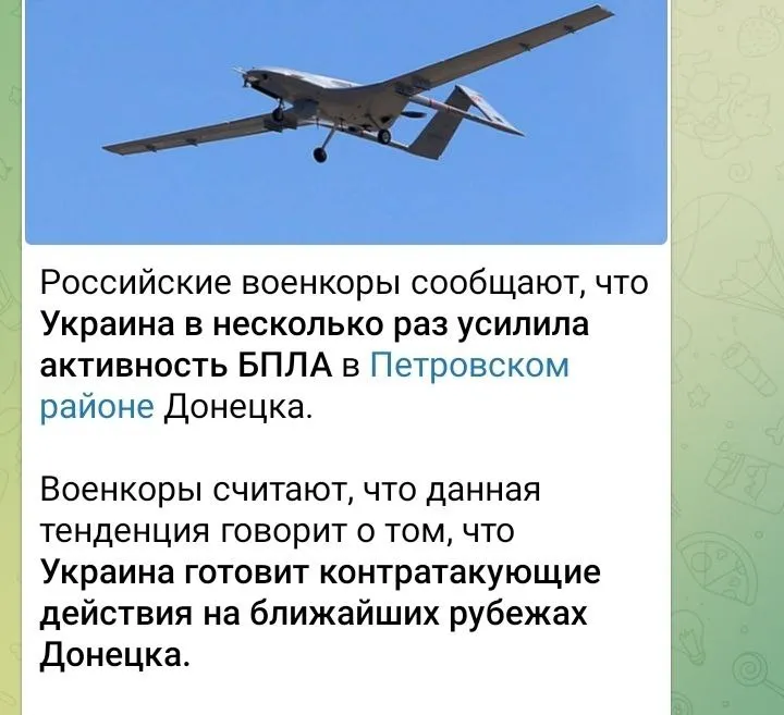 Журналіст Андрій Цаплієнко опублікував інформацію, яку поширюють у донецьких пабліках. У пабліках пишуть, що російські військові заявляють, що Україна начебто посилила активність БПЛА у Петровському районі Донецька.
