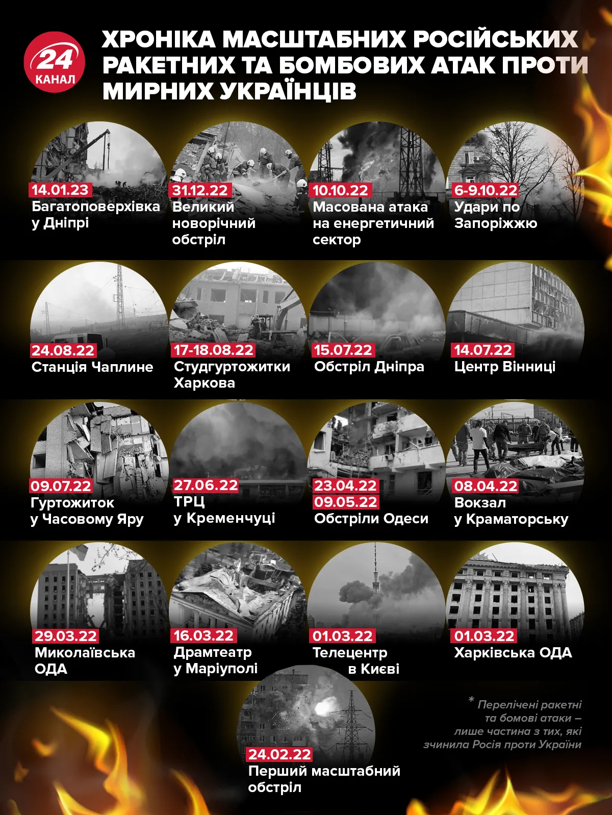 Українці в 2022 році не встигали оговтатися від одного горя, як наставало наступне, часом ще жахливіше. 24 Канал висловлює щирі співчуття всім нам, рідним та близьким загиблих у цій страшній війні. На жаль, Росія продовжує вбивати українців. Україна досі оплакує жертв страшного теракту в Дніпрі. Натомість терористи завдають нового ракетного удару по Краматорську в перший день лютого 2023 року, який забрав життя щонайменше 3 людей, 8 осіб – поранено. Воєнні злочини Росії проти України не будуть забуті й росіяни понесуть за них справедливе покарання. 24 канал нагадує хронологію атак окупантів на цивільну інфраструктуру України.
