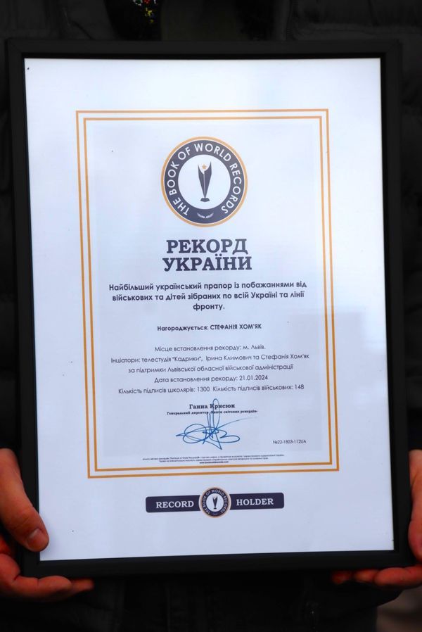 У центрі Львова зафіксували, що цей стяг став найбільшим прапором України, який зібрав найбільшу кількість підписів – 1448. На місці були присутні представники Книги рекордів України, які підтвердили рекорд документально.