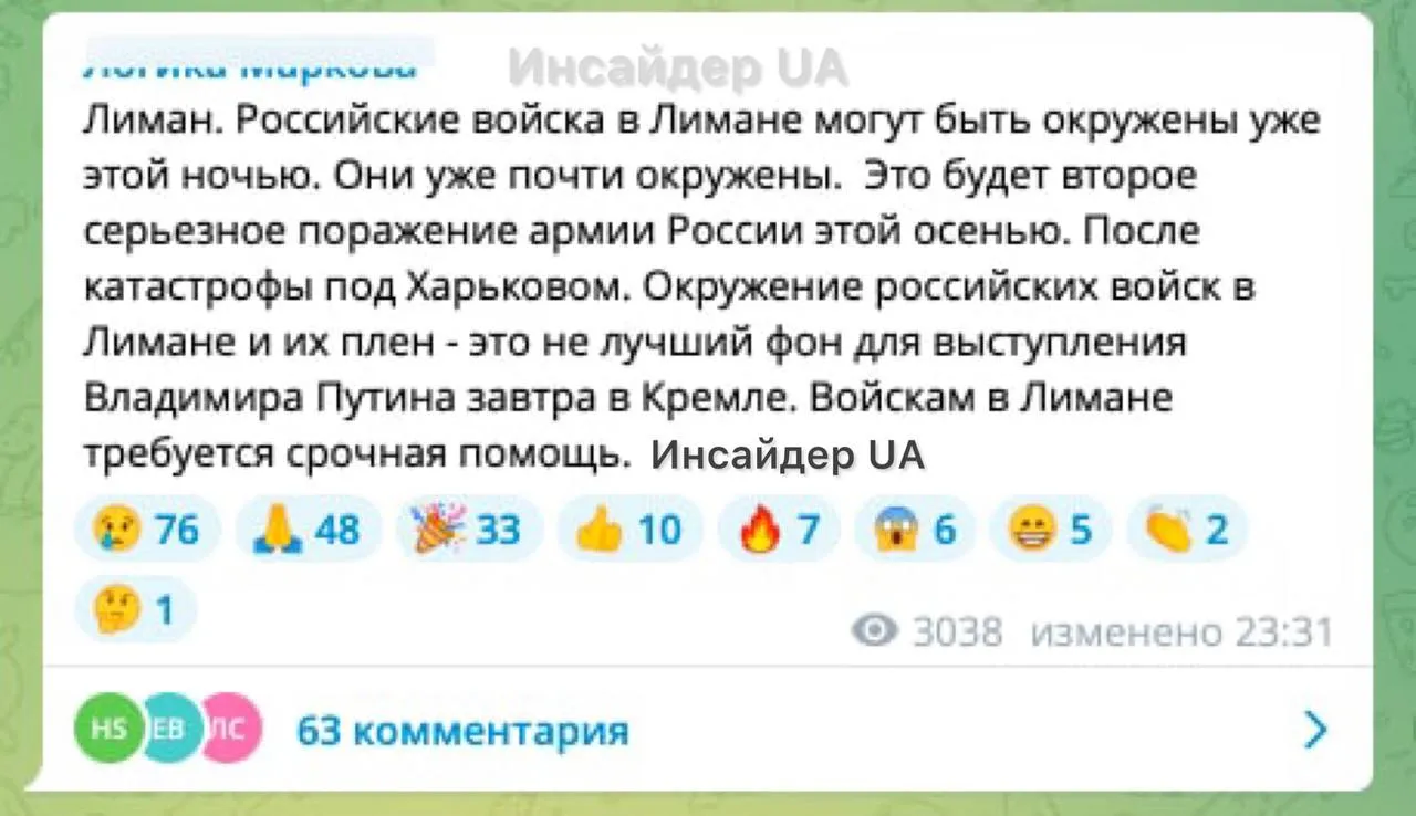 Російські військові телеграм-канали заповнені новинами про вкрай важку для російських військ ситуацію навколо Лимана.