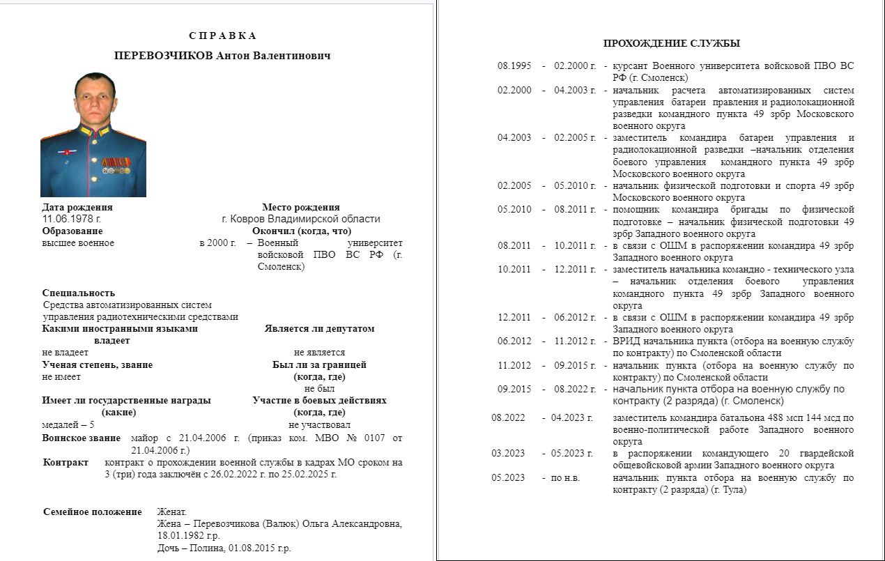 Кіберактивісти зламали пошту Антона Пєрєвозчікова, який у травні 2023 року став начальником пункту відбору на військову службу за контрактом в Тулі. Хакери з'ясували, що цей окупант з серпня 2022 року по квітень 2023-го був заступником командира 488 МСП 144 МСД по військово-політичній роботі. Це той самий 488-й полк, який Сили оборони повністю знищили під Харковом минулого року.