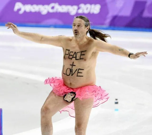 23 лютого на лід вибіг оголений чоловік в балетній пачці, а інтимні місця чоловік приховав за іграшкової мавпою. На грудях у чоловіка були написані слова "Мир + любов".