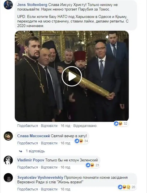 Знаєте, на відміну від наших великих політиків, я не хотів Вам марно обіцяти. І зараз, за кілька хвилин до Нового року я Вам дещо пообіцяю та одразу виконаю. Дорогі українці, я обіцяю Вам піти у Президенти України, і одразу виконую. Я іду у Президенти України. Давайте зробимо це разом. З Новим роком! З новим слугою народу!