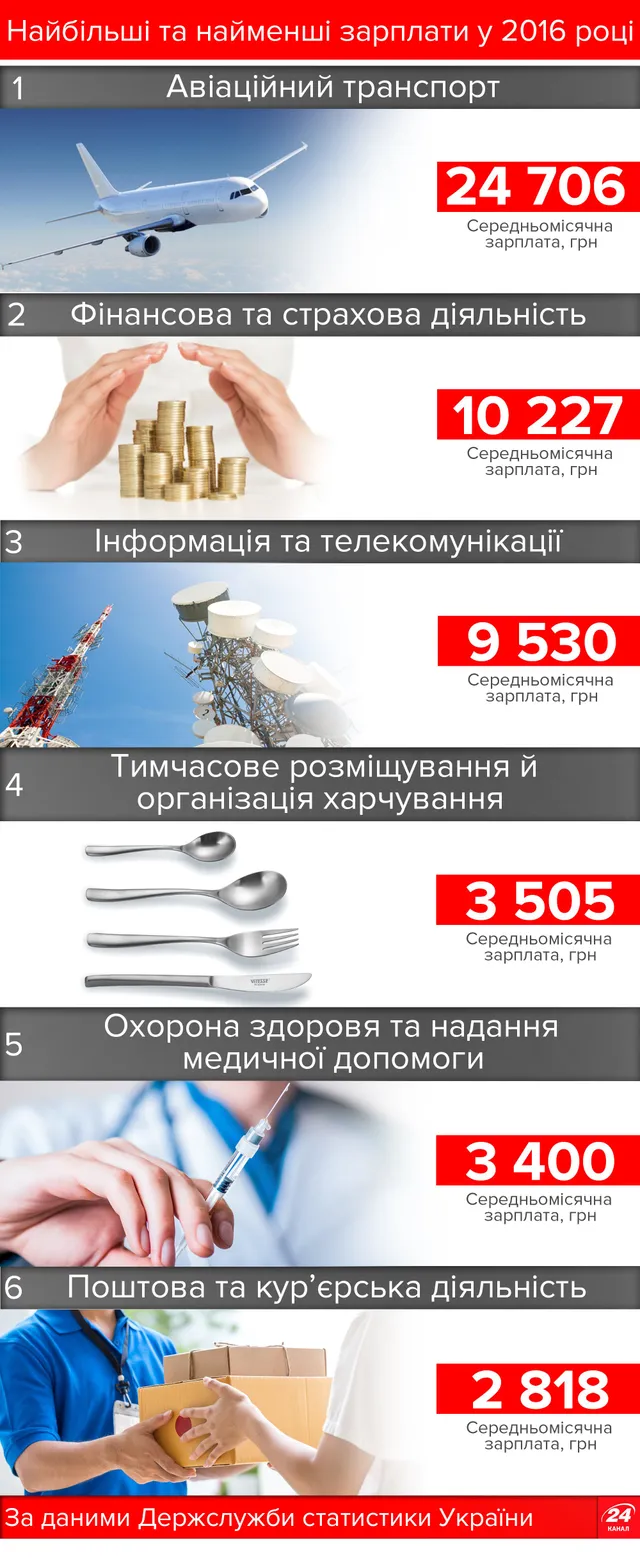 Упродовж всього року у рейтингу найоплачуваніших лідирує авіатранспорт — більше 20 тисяч гривень середньомісячна платня. Непогано заробляють також фінансисти та страховики — понад 10 тисяч на місяць.
