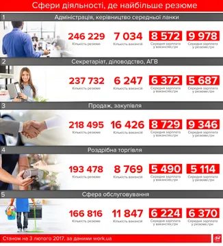 На порталі work.ua п'ятірка сфер діяльності з найбільш затребуваними вакансіями в Україні виглядає наступним чином (в порядку зменшення): закупівлі та продаж, сфера обслуговування, робочі спеціальності та виробництво, роздрібна торгівля, і ІТ, компютери та інтернет.