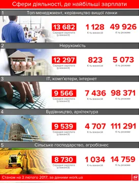 Натомість за даними порталу robota.ua (аналітика за 3 квартал 2016 року) свідчить, що найбільше роботодавці готові платити веб-розробникам — понад 23 тисячі гривень. 10 500 — будівельникам робочих спеціальностей, та трохи більше 9 900 грн — водіям.