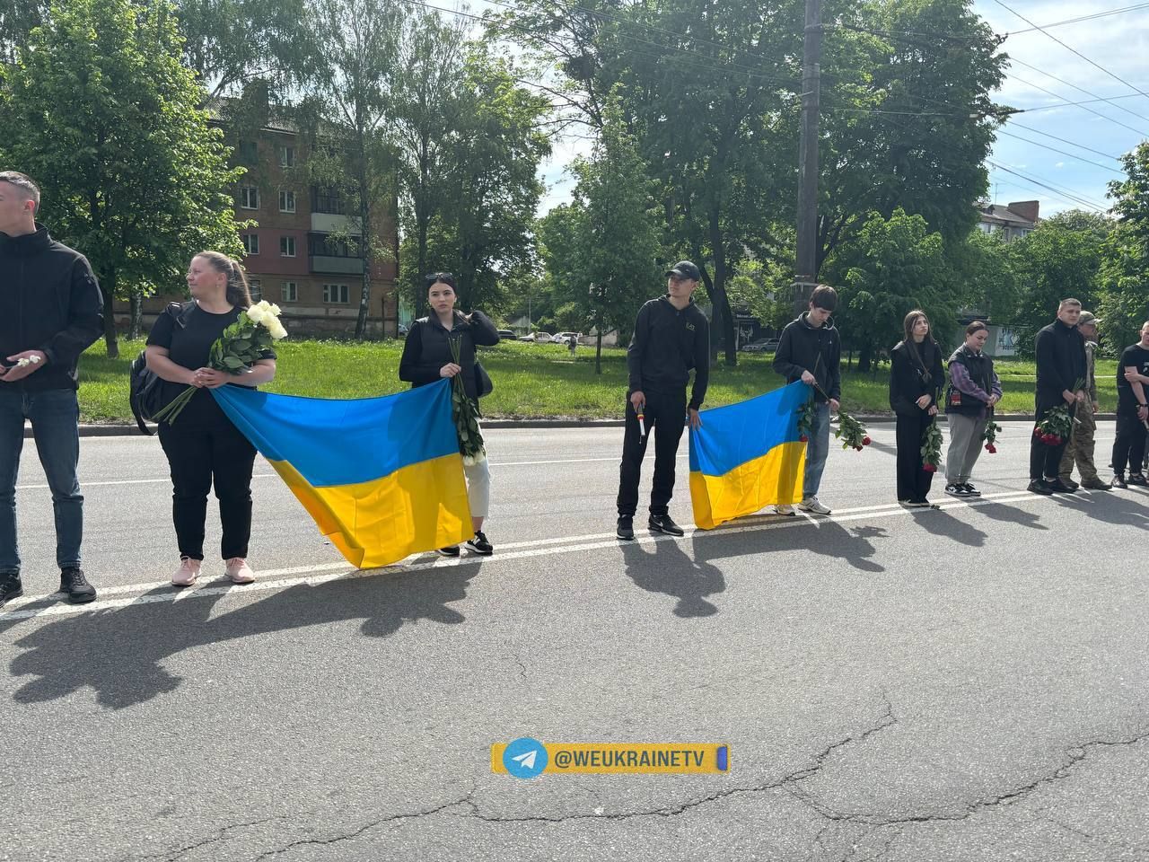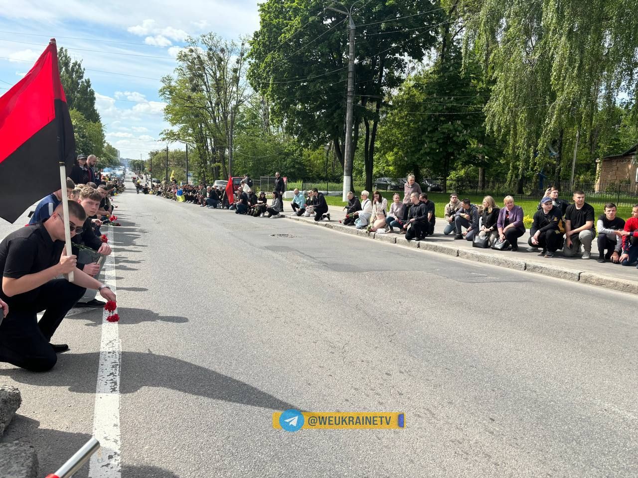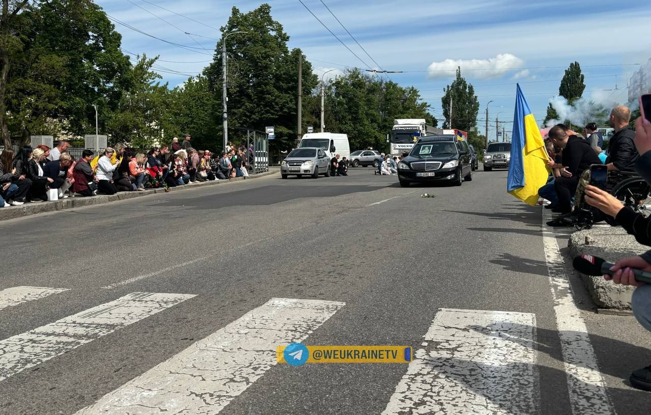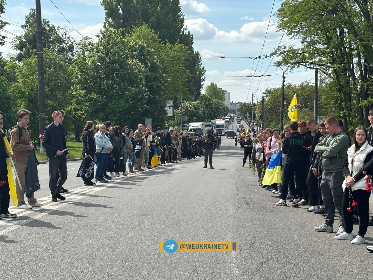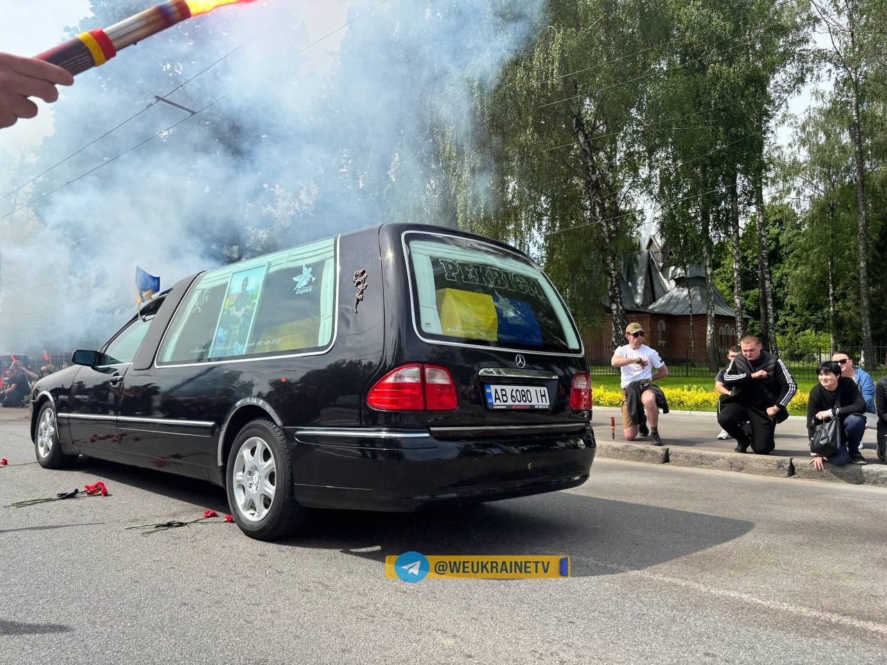 Коли автівка проїжджала живим коридором, люди ставали на коліна, висловлюючи свою глибоку повагу загиблому українському захисникові. Прощання із Назарієм Гринцевичем має відбутися 10 травня на Алеї Слави у Вінниці.
