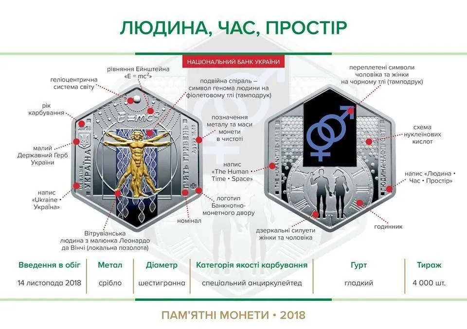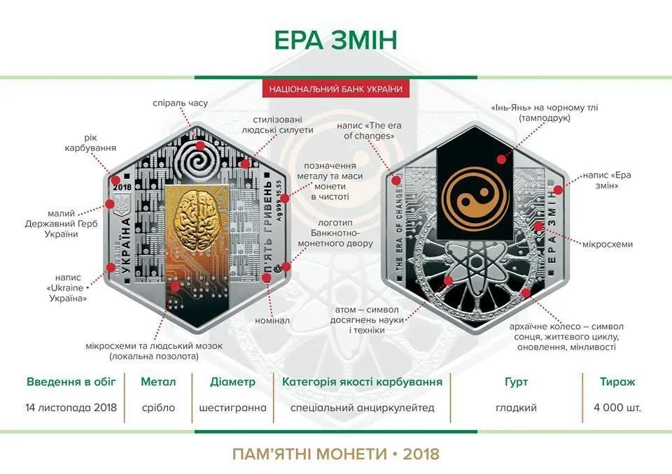 Всі вони виготовлені вони зі срібла 999 проби. Є чотири види пам'ятних монет, які входять в набір "Ера миру", "Ера змін", "Ера технологій", "Людина, час, простір".