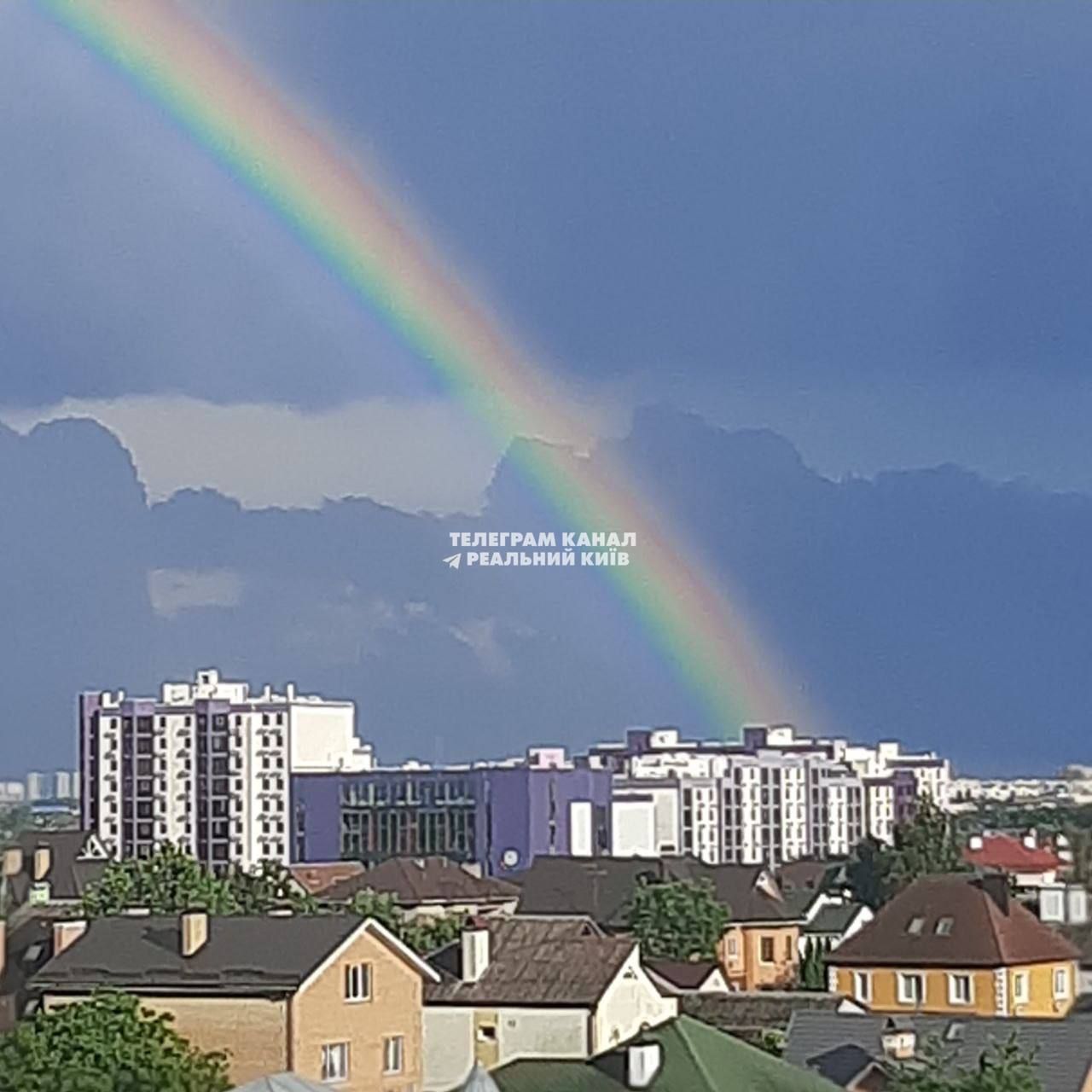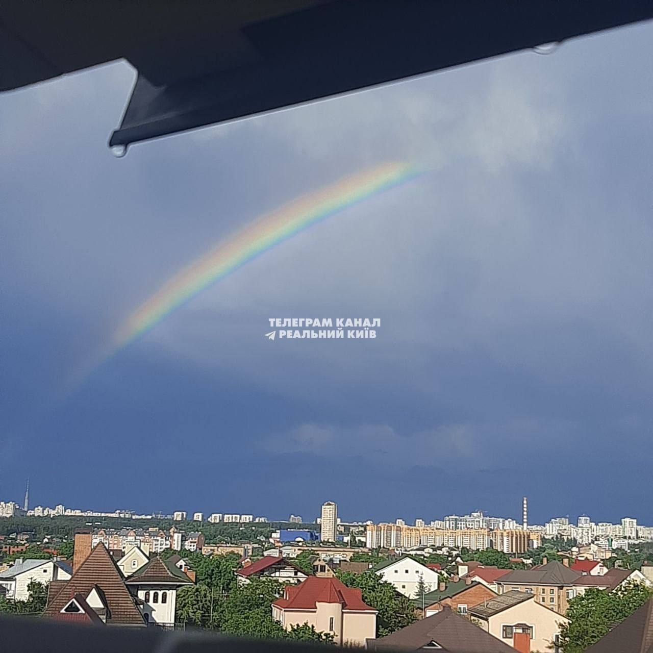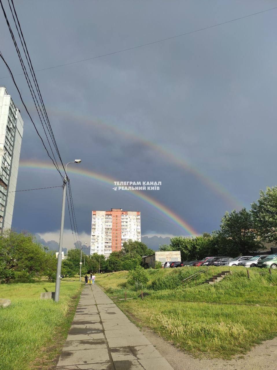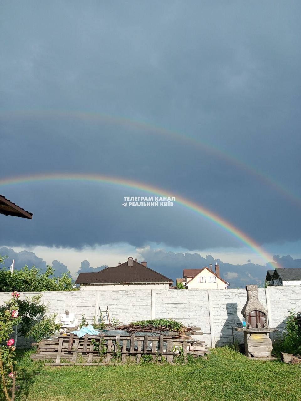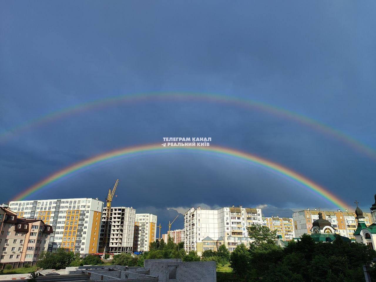У Києві після грози помітили велику подвійну веселку. Вона з'явилась на небі після потужної зливи та граду.