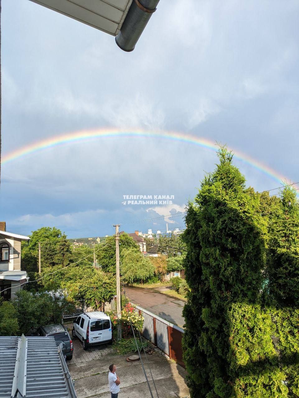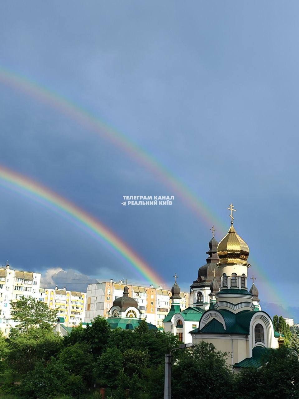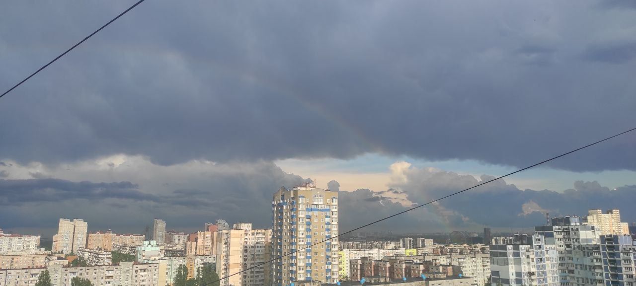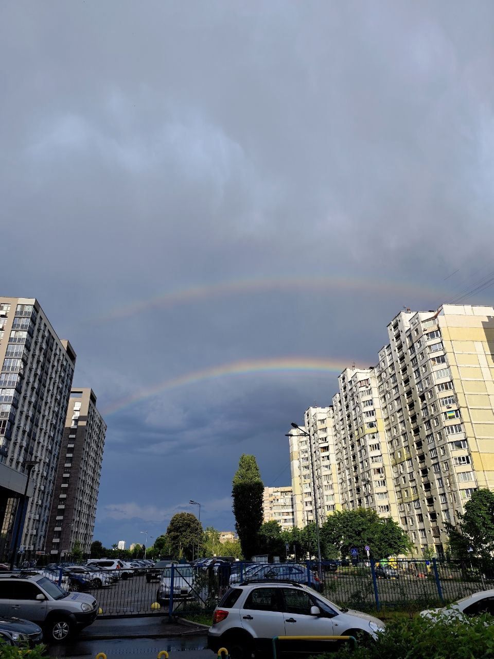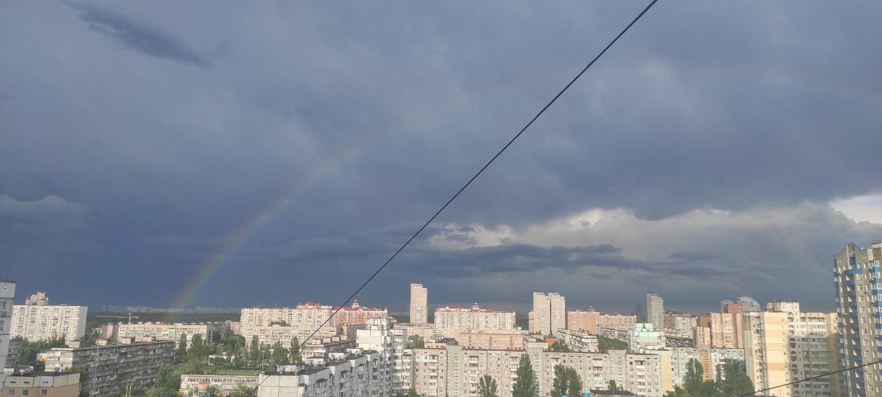 У Києві після грози помітили велику подвійну веселку. Вона з'явилась на небі після потужної зливи та граду.