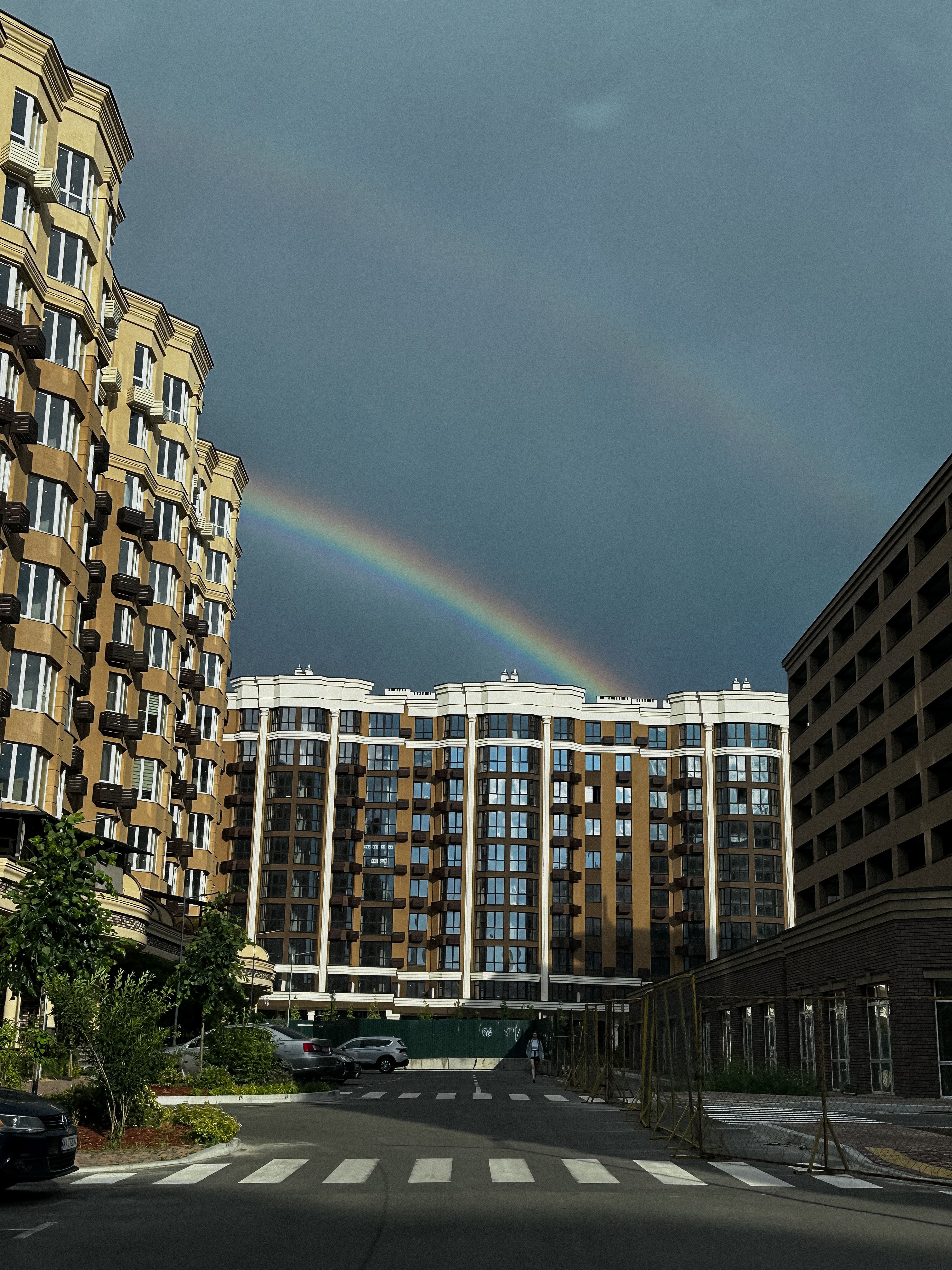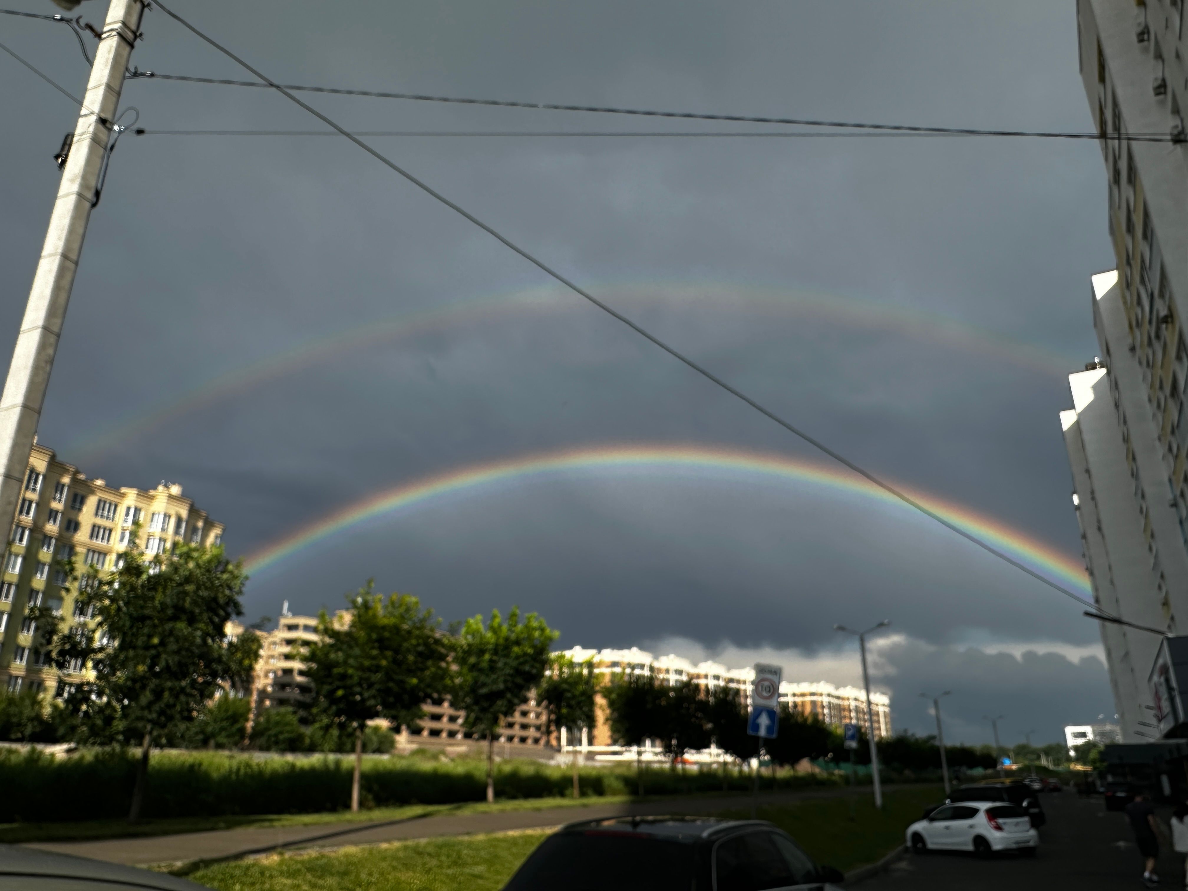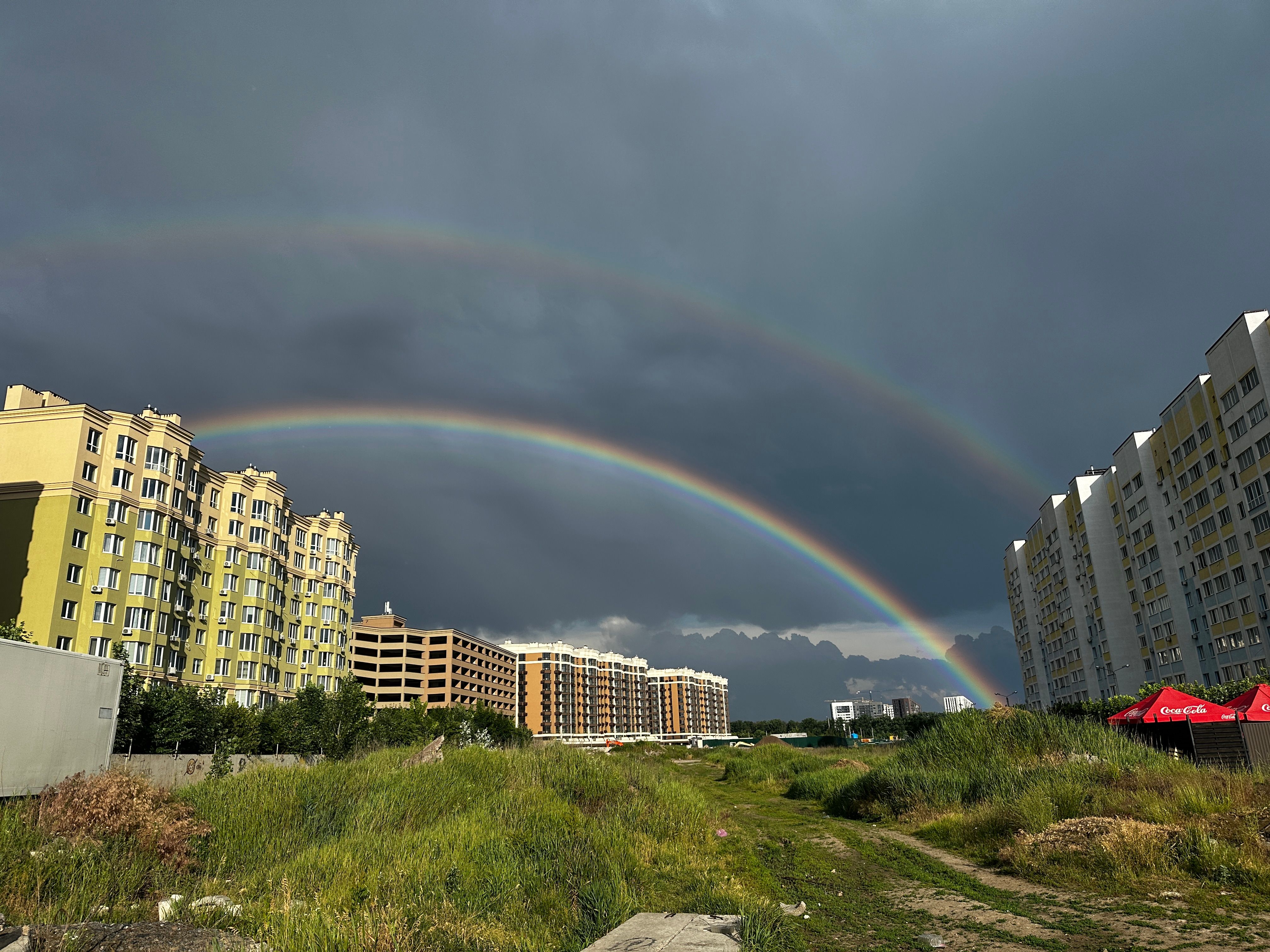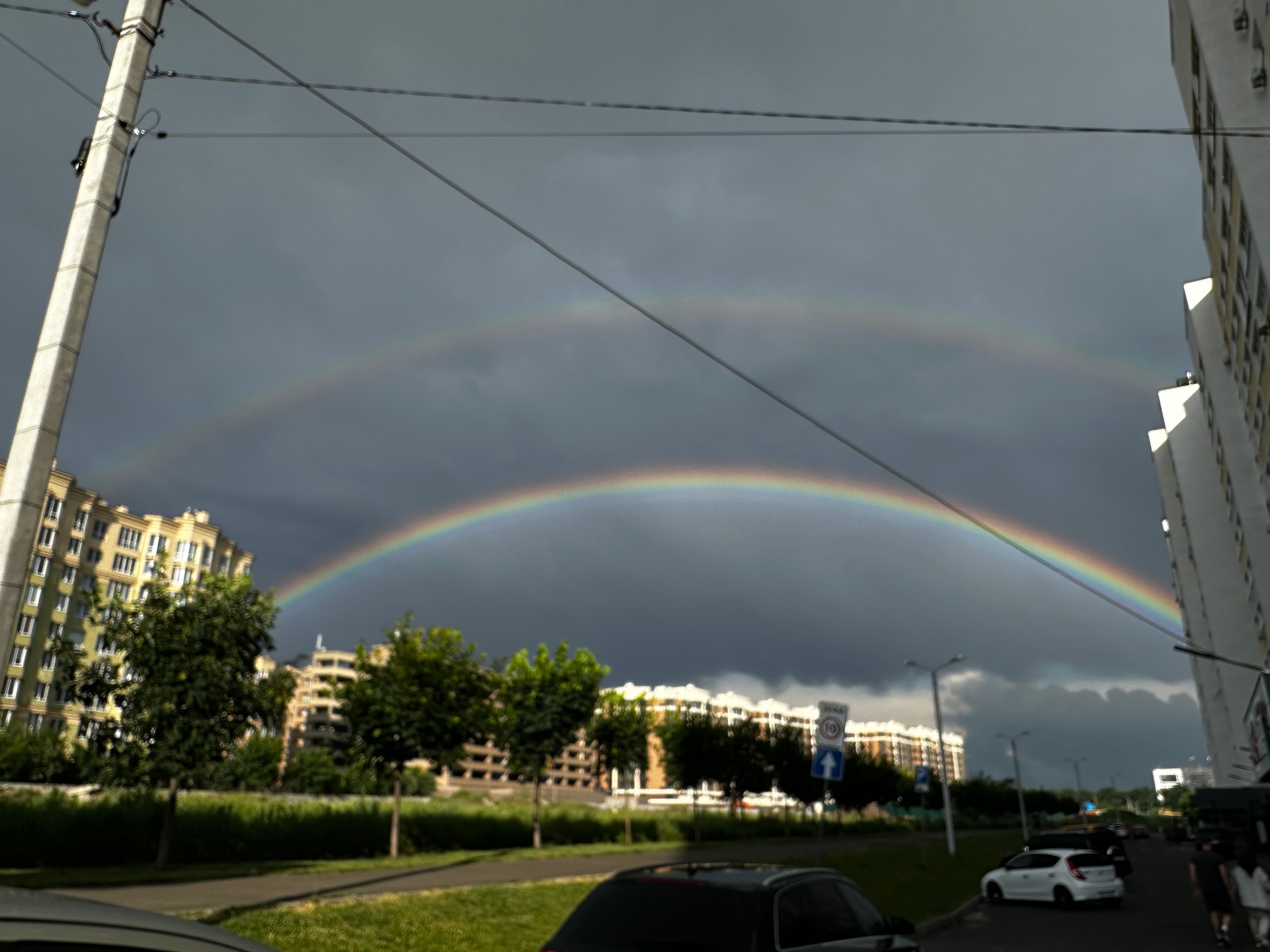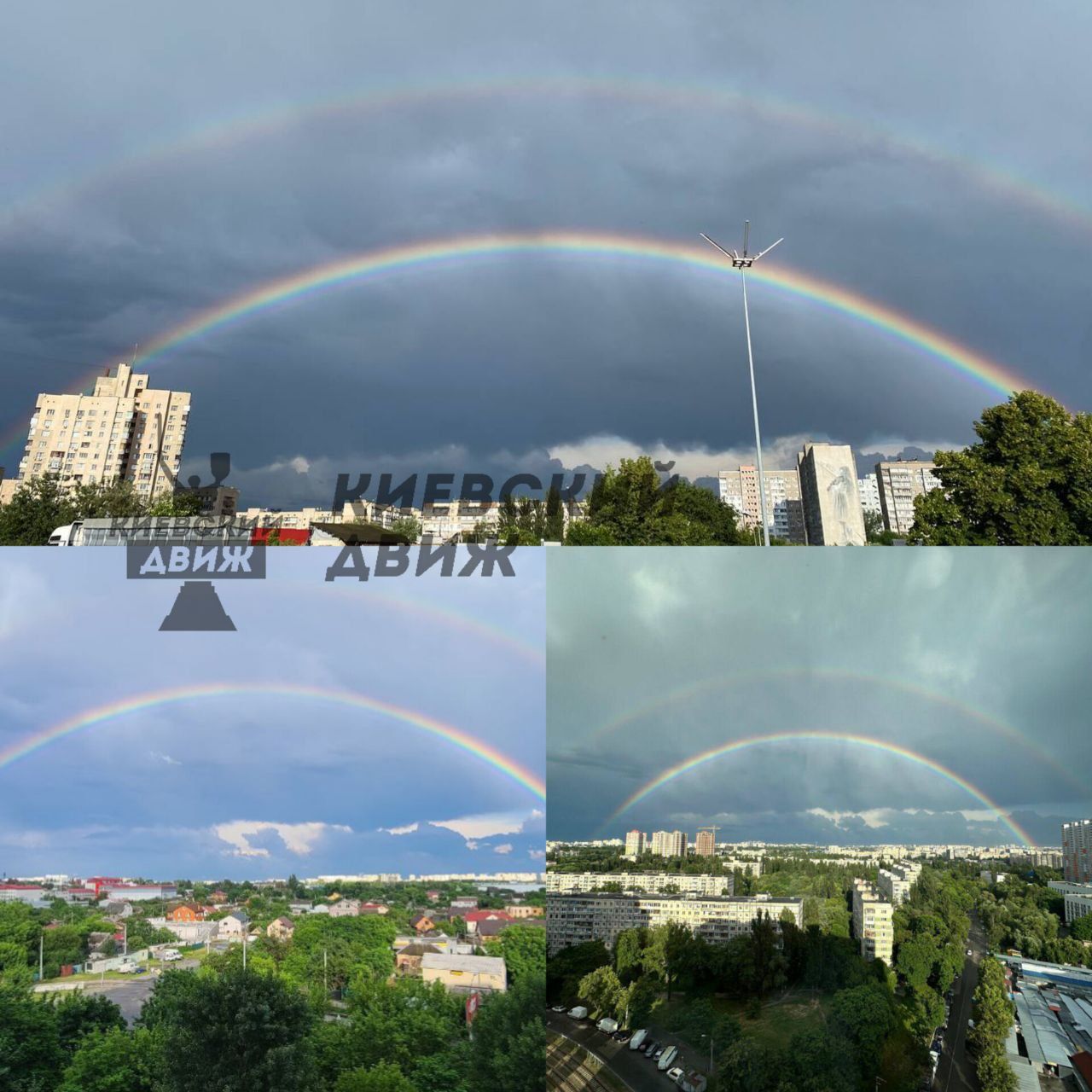 У Києві після грози помітили велику подвійну веселку. Вона з'явилась на небі після потужної зливи та граду.