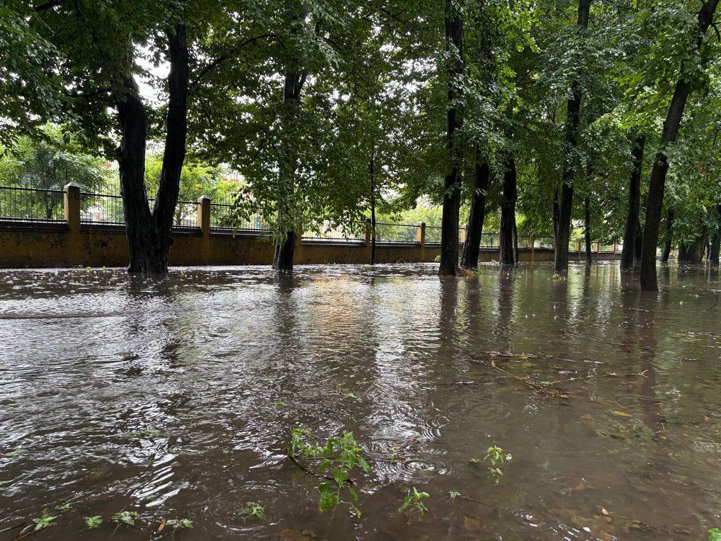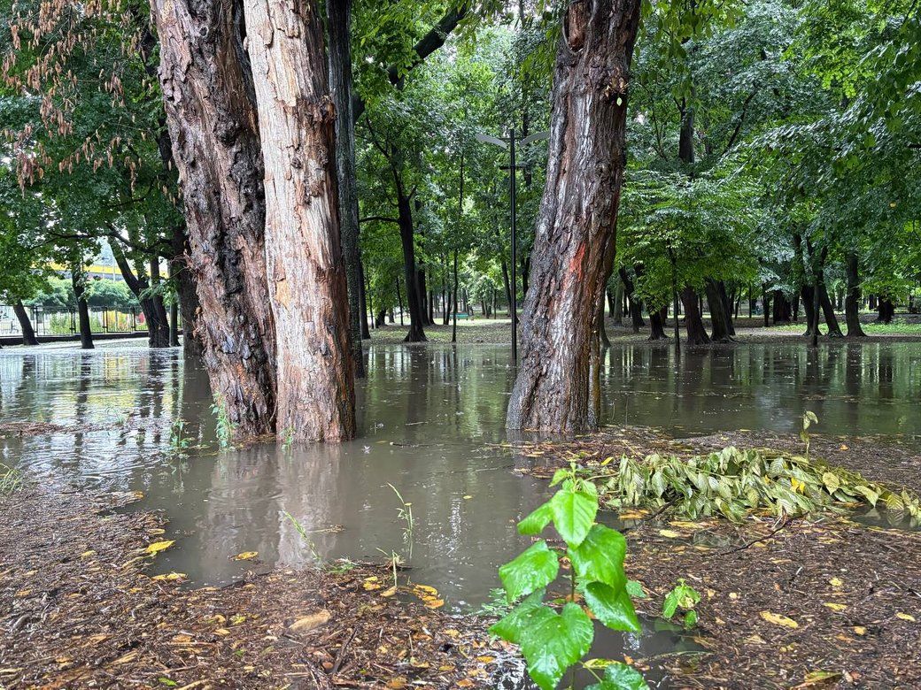 Сильні опади перевантажили каналізаційні та дренажні системи, про що повідомили у водоканалі. У парку Шевченка затопило частину території та доріжок. Журналісти розповіли, що вода з парку ллється на тротуари вздовж вулиці Головної.