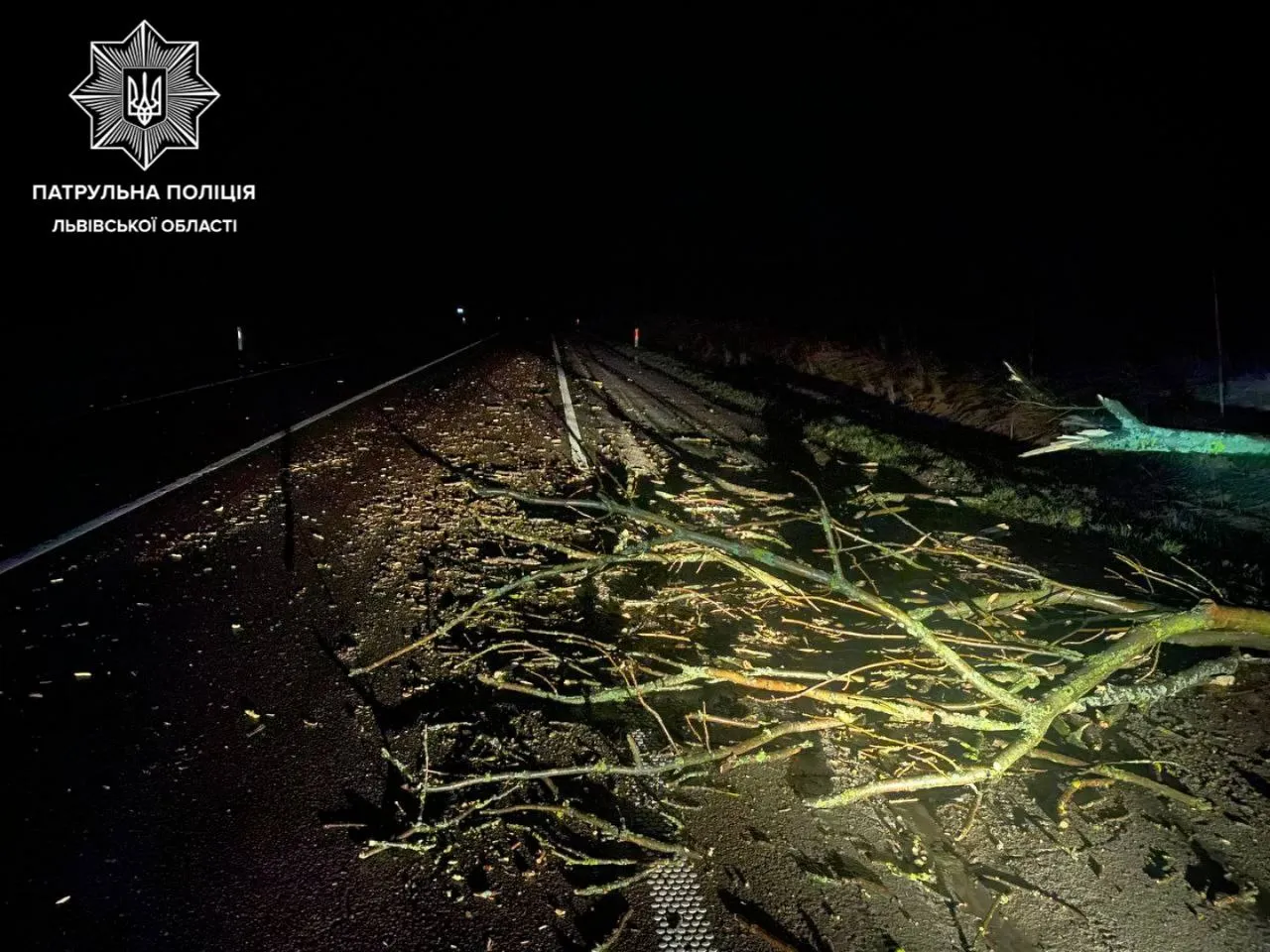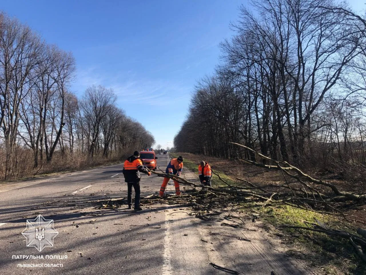 Так, в області фіксують падіння дерев, зокрема, на проїжджі частини. На місцях вже працюють дорожні служби, а патрульні забезпечують регулювання руху.