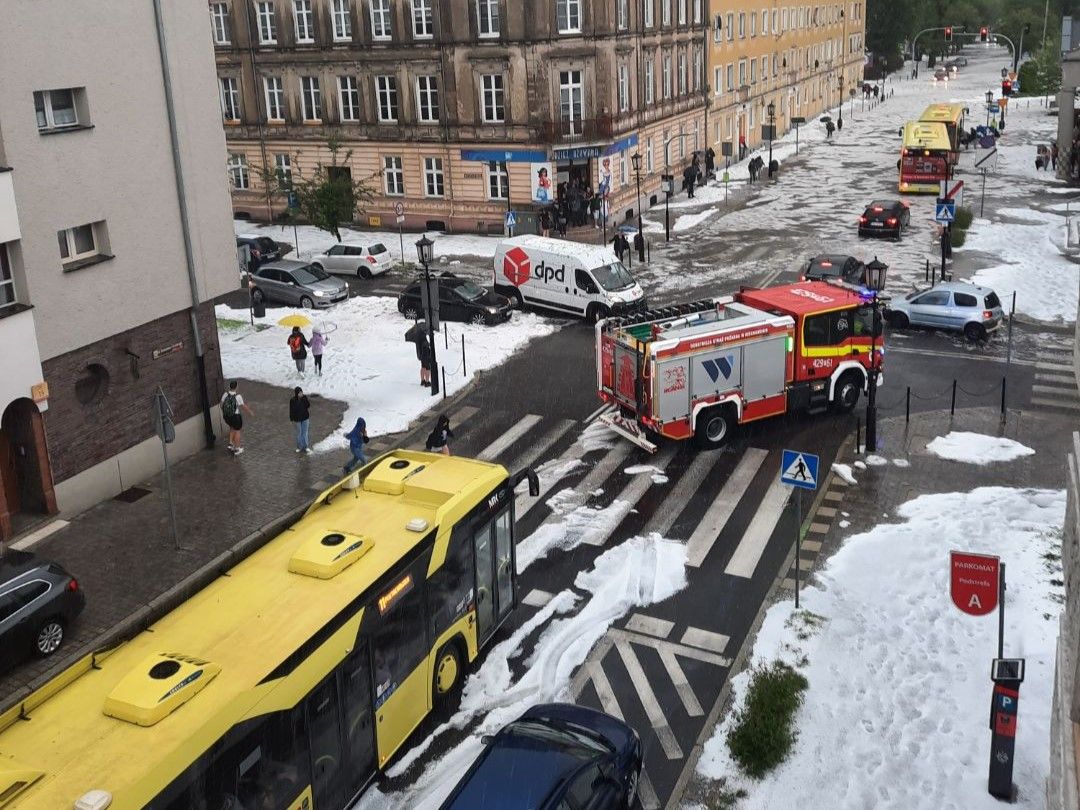 У місті Гнєзно одна жінка опинилася у пастці у своєму автомобілі, який був затоплений водою. Завдяки вчасній допомозі свідка, її вдалося врятувати. У цьому регіоні випало стільки граду, що дороги вкрилися білим килимом.