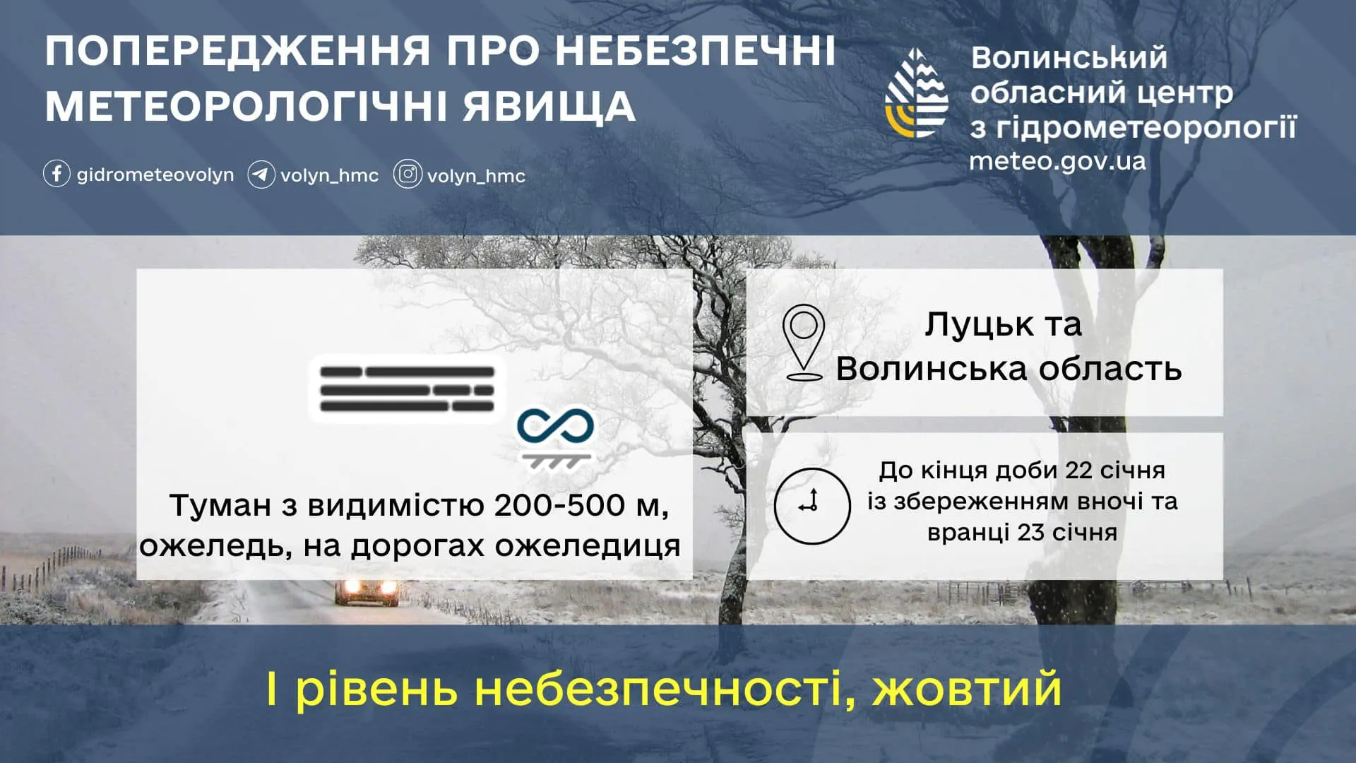 У Луцьку та по області до кінця доби 22 січня, із збереженням вночі та вранці 23 січня, очікується туман з видимістю 200 – 500 метрів, ожеледь (діаметр 6 – 19 міліметрів), на дорогах ожеледиця.