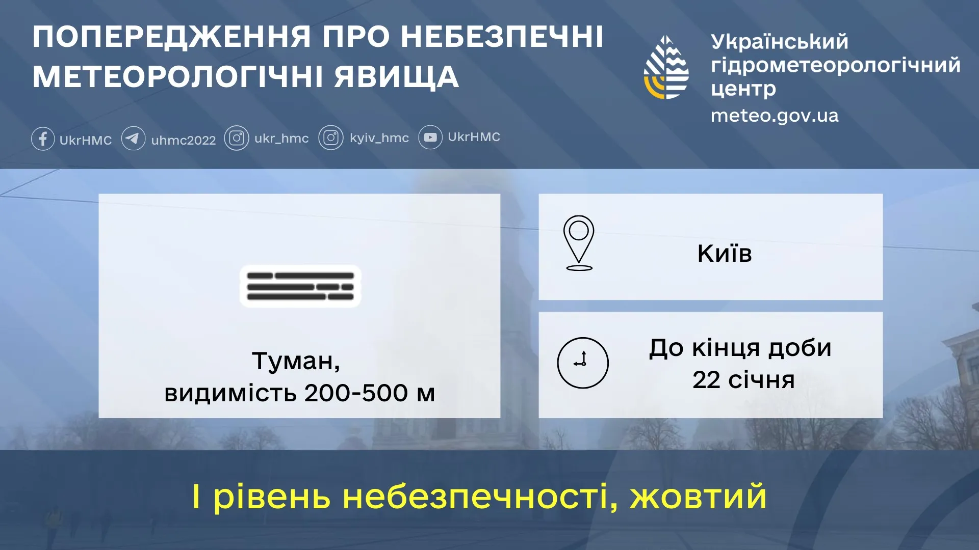 У Києві до кінця доби прогнозується туман, видимість складатиме всього 200 – 500 метрів. Оголошено І рівень небезпечності, жовтий.