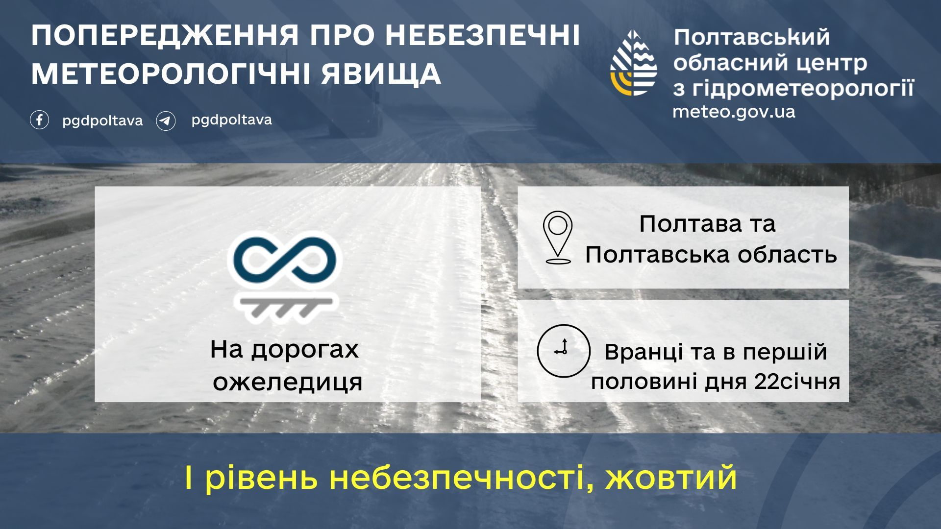 У Полтаві та області вранці та в першій половині дня 22 січня на дорогах ожеледиця (I рівень небезпечності, жовтий).