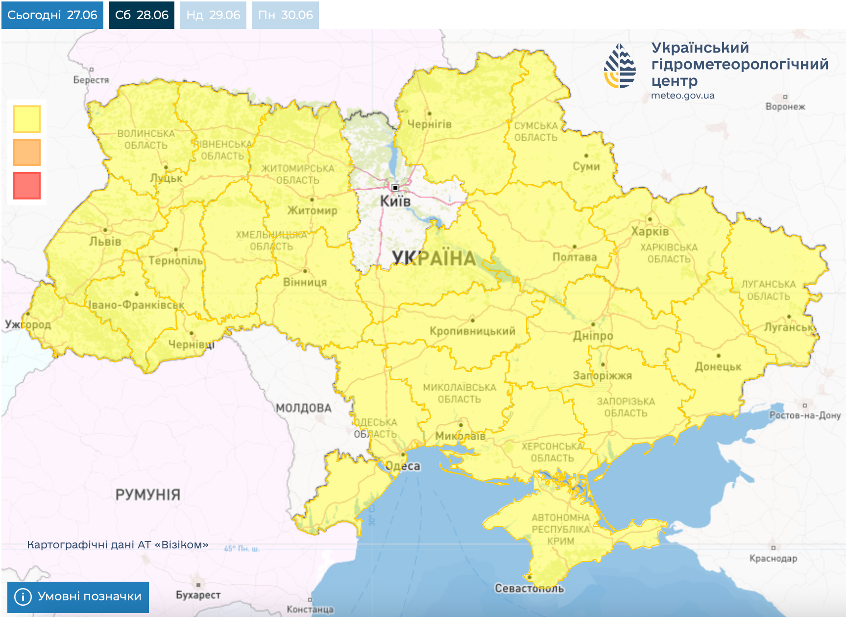 Цікаво! Небезпечні метеорологічні явища на 28 червня не прогнозують лише у Києві й області.