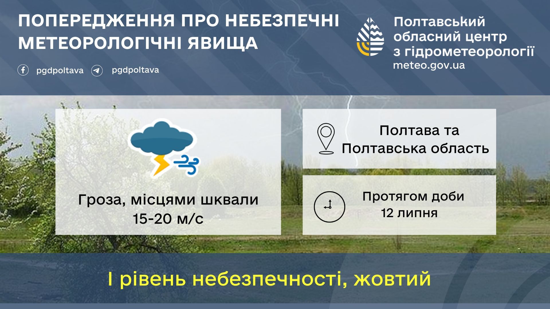 Негода також накриє Полтавщину. Протягом доби 12 липня будуть грози, подекуди по області шквали, 15 – 20 метрів на секунду. Це I рівень небезпечності (жовтий).