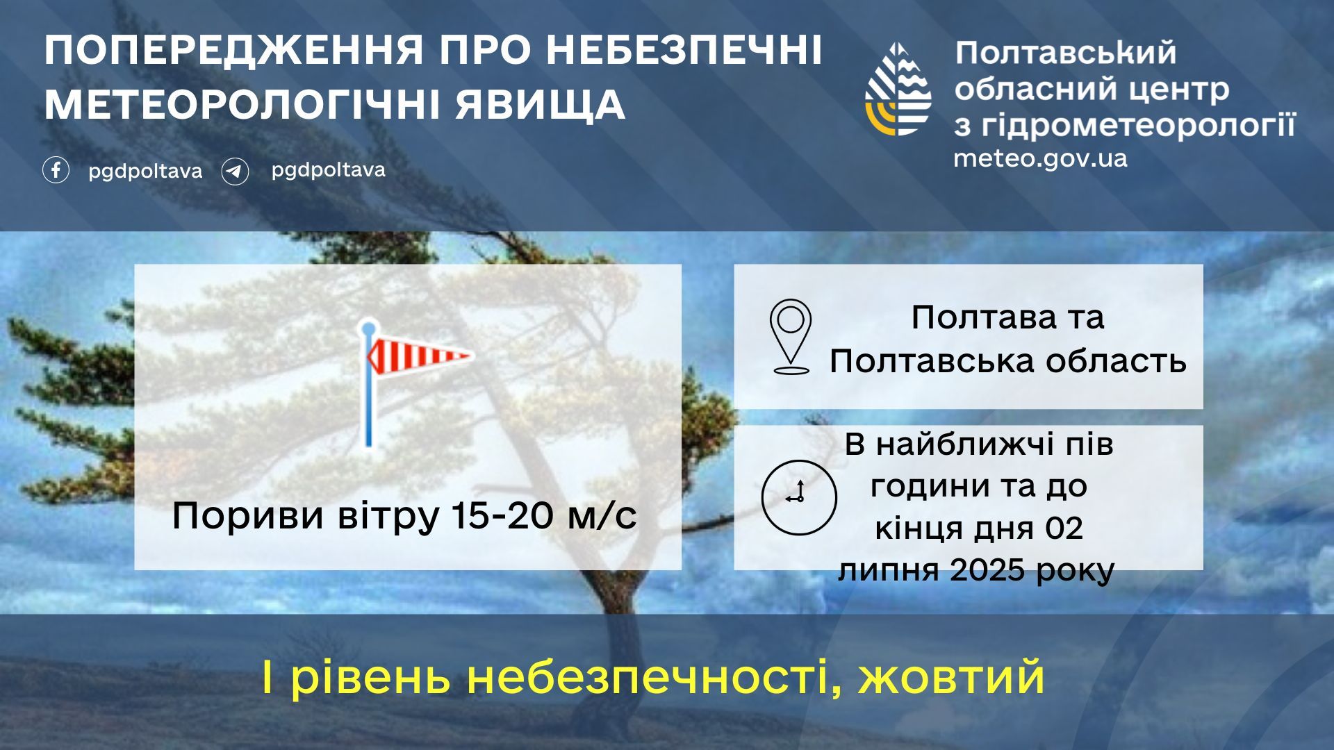 Полтавський обласний центр з гідрометеорології повідомив, що до кінця дня 2 липня на Полтавщині пориви вітру 15 – 20 метрів на секунду. Це I рівень небезпечності (жовтий).