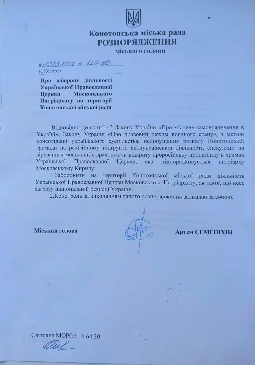 У розпорядженні мовиться: "заборонити на території Конотопської міської ради діяльність Української православної церкви Московського патріархату як такої, що несе загрозу національній безпеці України".