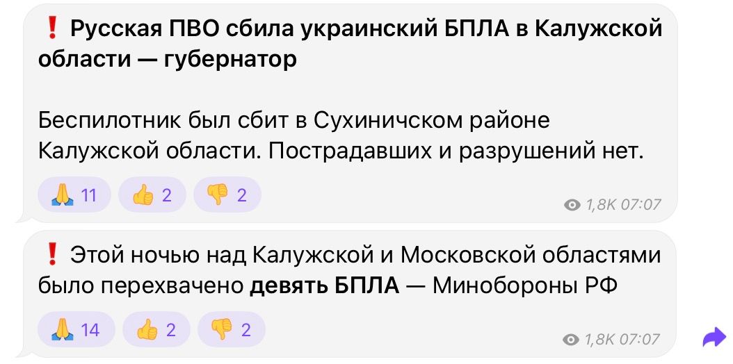 Уточнимо, що достеменно невідомо, які саме об'єкти намагалися уразити наші БпЛА під Москвою та Калугою. Однак, вочевидь, вони неабияк стривожили росіян.