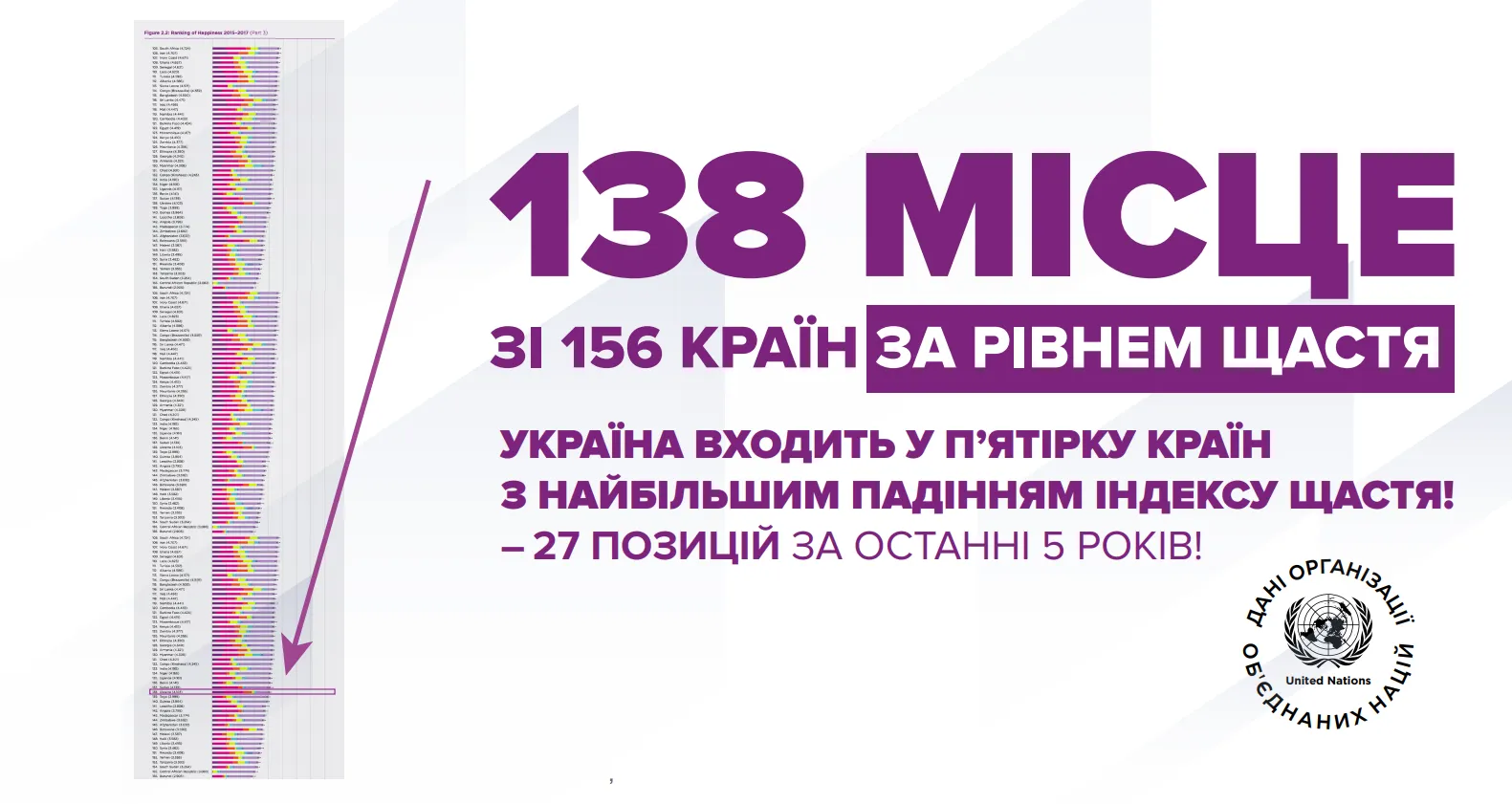 У 2018 році Україна посіла 138 місце (одне з найнижчих) у рейтингу оцінки щастя, опустившись за останні 5 років на 27 позицій, – із сумом констатувала Юлія Тимошенко.