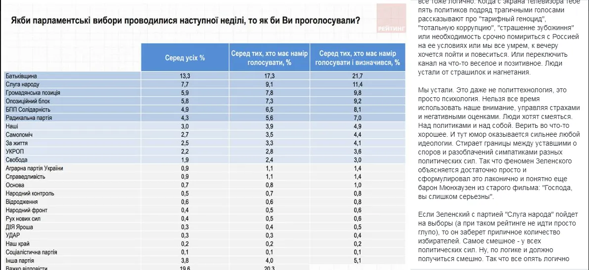 Опитавши 10 тисяч чоловік, соціологи з’ясували, що лідером президентських симпатій залишається Юлія Тимошенко. Петро Порошенко – лише на третьому місці, а на друге вийшов керівник студії "Квартал 95" Володимир Зеленський. Його партія "Слуга народу" – також друга у парламентському рейтингу. Крім того, соціологи змоделювали розклад сил у парах другого туру. Так, Порошенко програє всім суперникам, при цьому найбільш впевнено його "б’є" саме Зеленський – 28% проти 15-ти. Зі свого боку, Зеленський програє Тимошенко, поступаючись лише 3%.