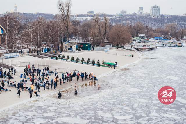 Багато киян прийшли на міські пляжі, аби скупатися у крижаній воді. Найбільший ажіотаж помітили у Гідропарку. Там комунальники розчистили берег від льоду, щоб охочі пірнути в ополонку могли без перешкод зайти в Дніпро. Загалом у столиці облаштували 15 локацій для зимових купань.