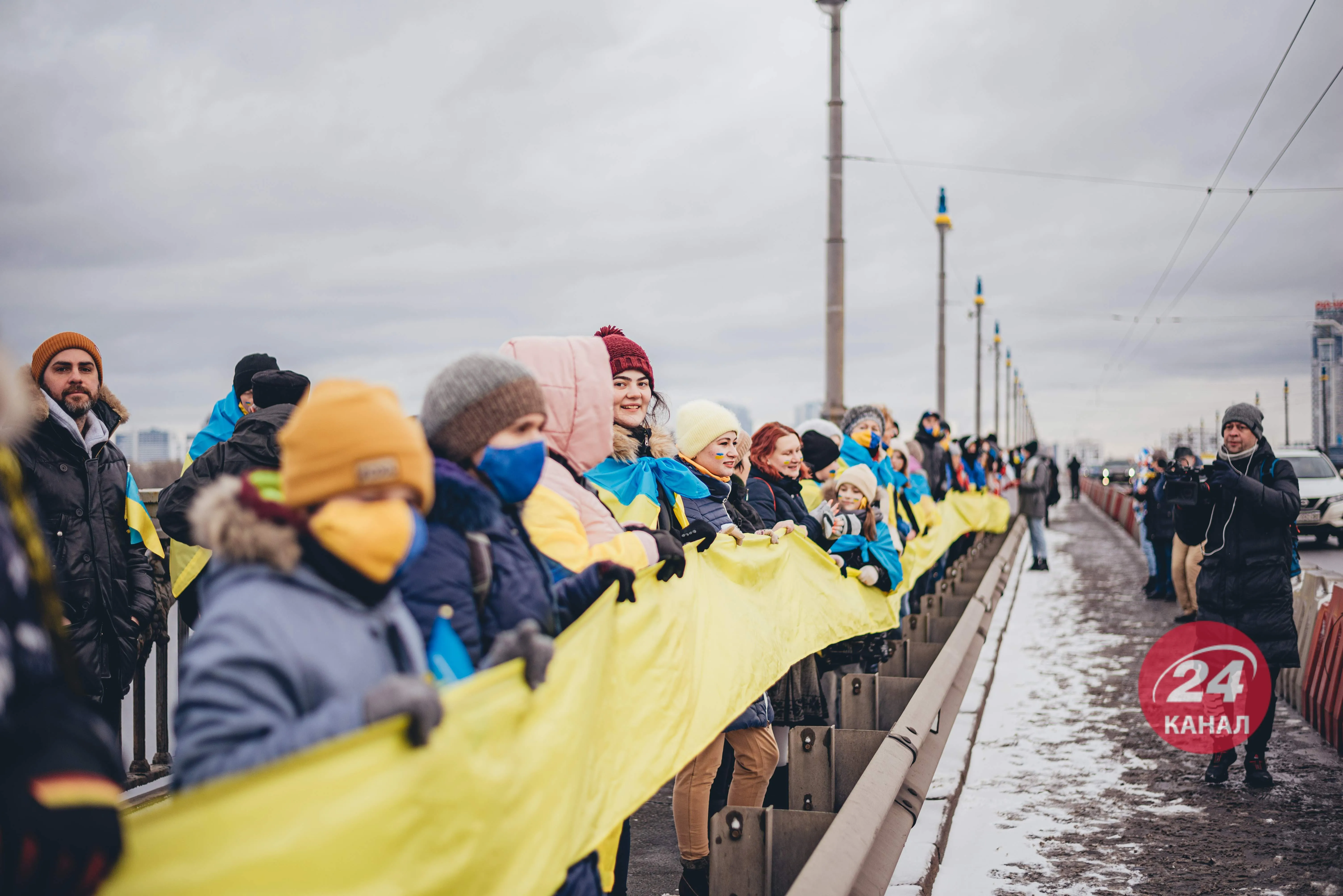 В містах України 22 січня відбулися урочисті заходи з нагоди Дня Соборності. У цей день у 1919 році проголосили Акт Злуки УНР та ЗУНР. Цього року у Києві розгорнули 30-метровий прапор та створили "живий ланцюг" на мосту Патона. До акції долучилися кияни різного віку.