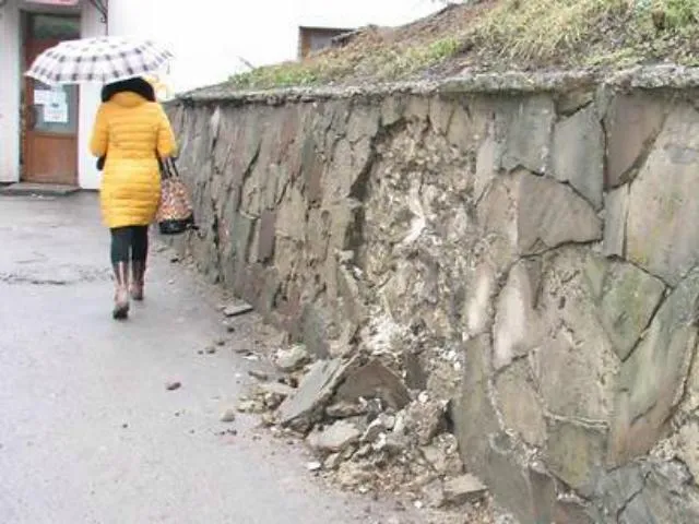 Ще одна небезпека - у стінці, яка втримує схил. Одну її частину полатали ще минулого року. Але місцями падає просто на тротуар, а тала вода ще більше зруйнувала її.