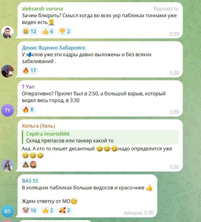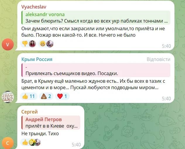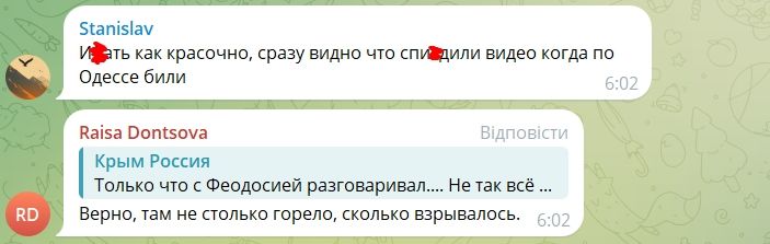 Цікаво, що серед купи таких цинічних коментарів можна знайти й бідкання. Зокрема, частина російських коментаторів вважають, що ніякого вибуху у Феодосії не було, а всі фото та відео це буцімто "фейк", ІПСО та постановка.